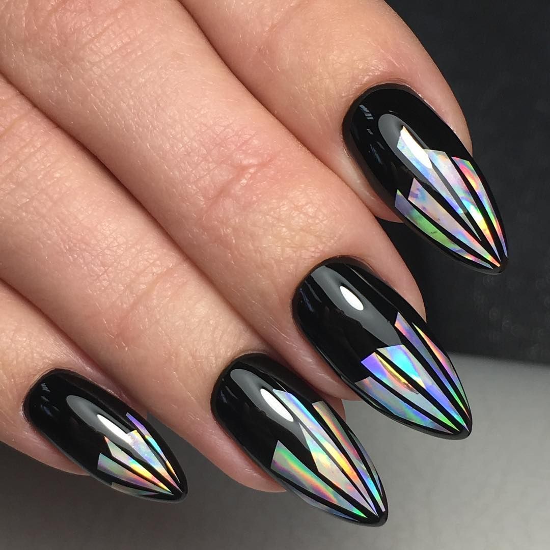 Для эффекта вечернего или праздничного маникюра добавляется треугольник или другая фигура, покрытая серебряным глиттером. Остальные ногти покрывают лаком по всей поверхности. Техника негативного пространства во французском маникюре сочетается с паутиной, узорами, геометрией, цветами.