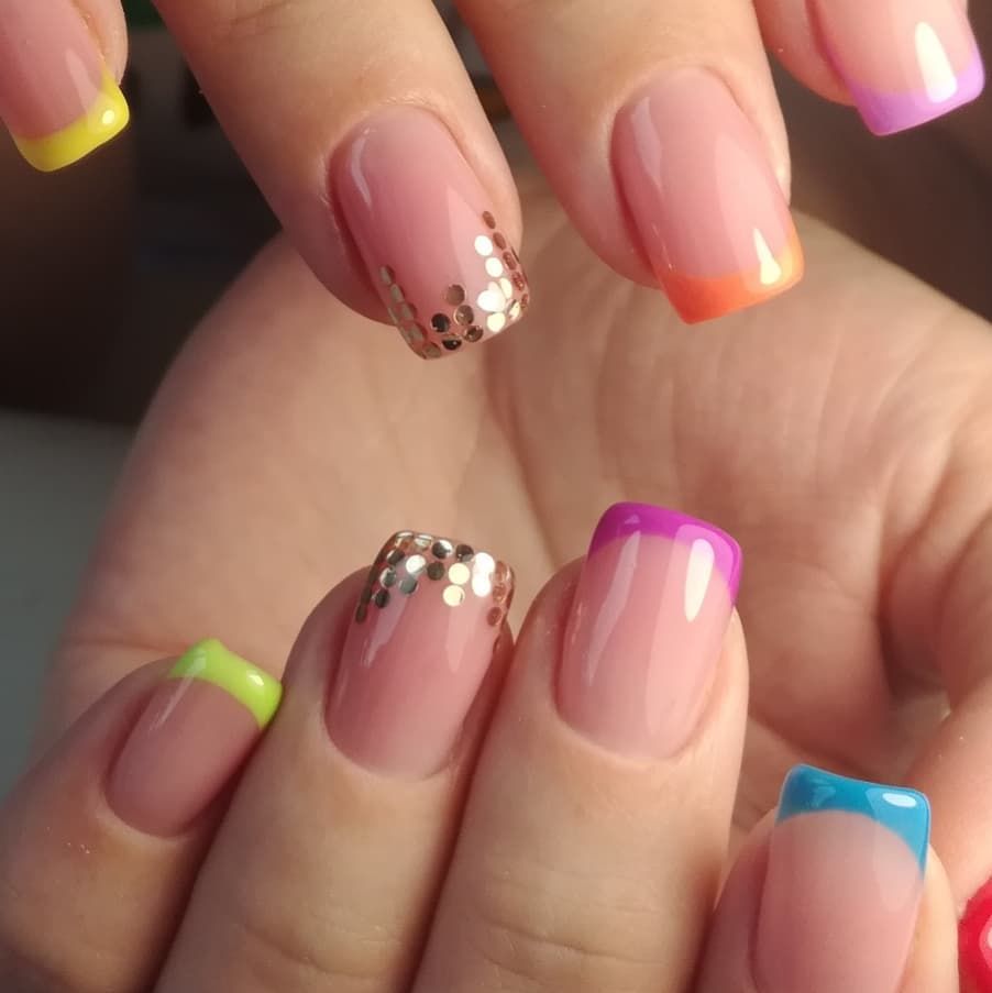 Французский маникюр с цветным кончиком. Этот вариант отличается от классического маникюра наличием яркого цвета на кончике ногтя вместо белого. Цвет может быть любым, в зависимости от вашего настроения и предпочтений.