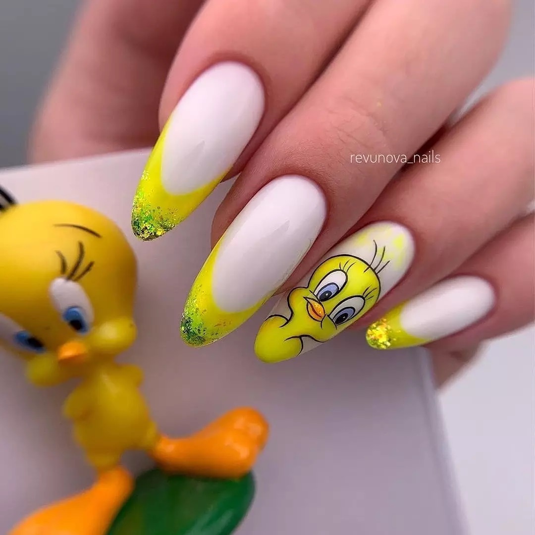 Приклеивают на кончики ноготков трафареты, сразу располагая их точно и правильно. Прорисовывают линию улыбки белым лаком.