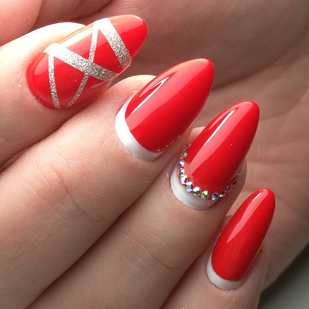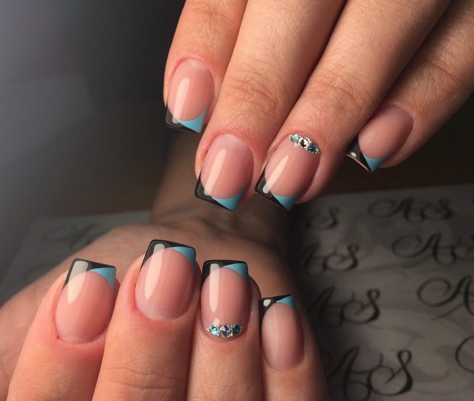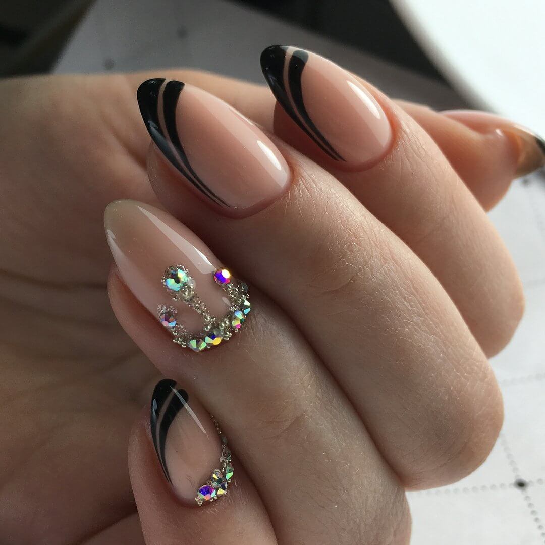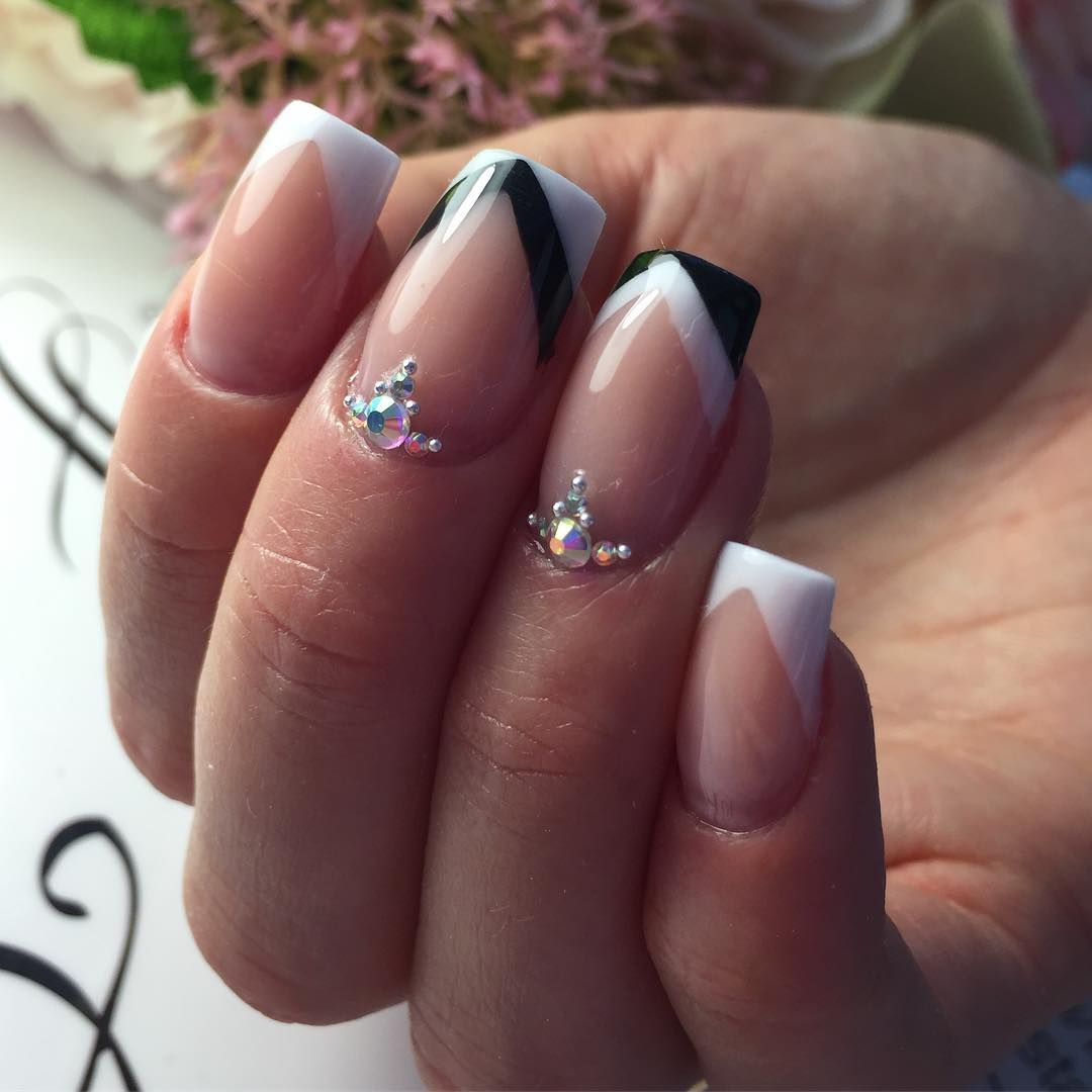 Стразы прекрасно подойдут к круговому, графичному френчу с дополнением на 2 пальцах. Все зависит от дизайна, но можно использовать, как повседневный вариант.
