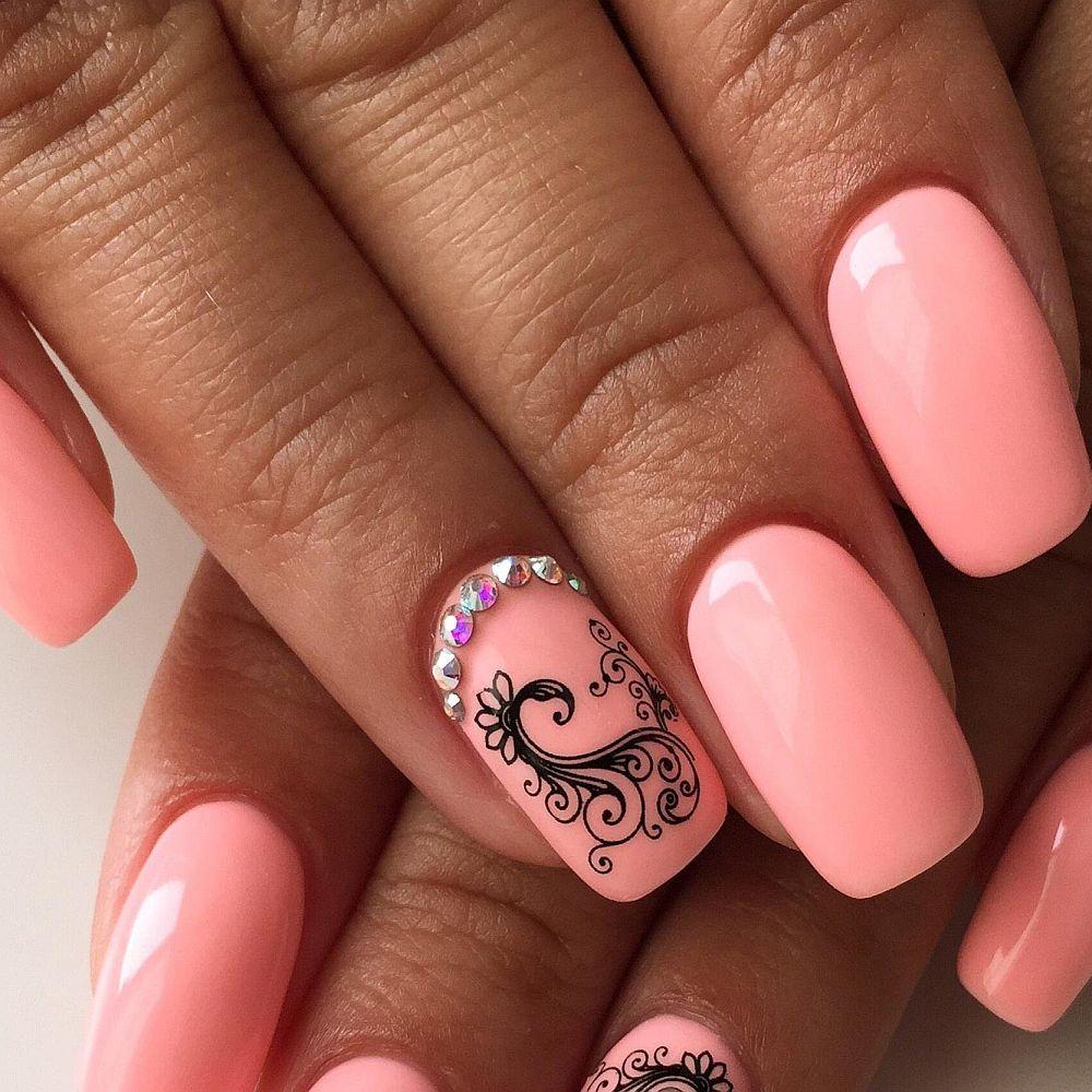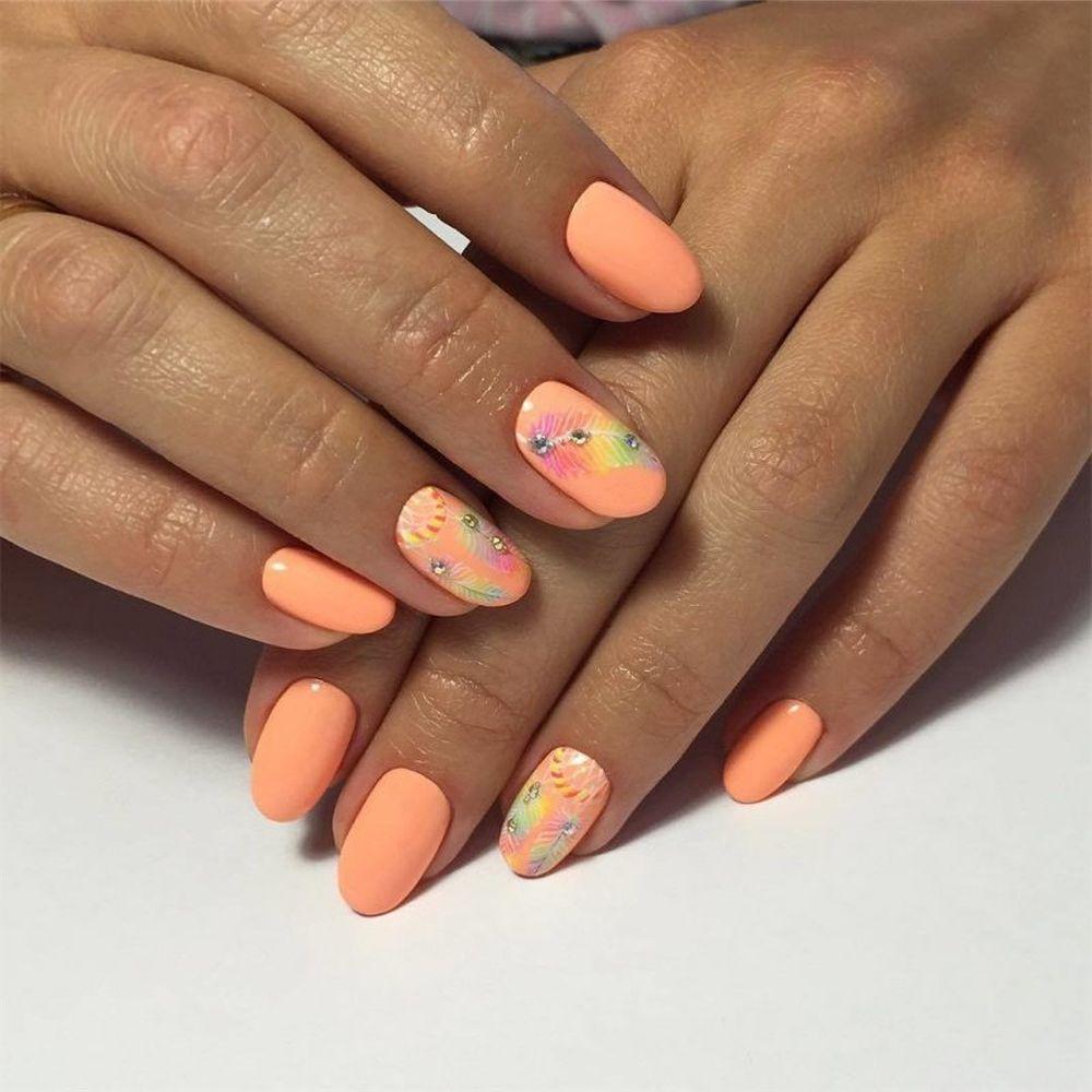 Нежный дизайн, выполненный в персиковом или коралловом тонах, придает естественности и свежести. Для придания луку индивидуальности можно использовать в декоре цветы, блестки, камни, стразы. Маникюр красиво смотрится в матовом исполнении.