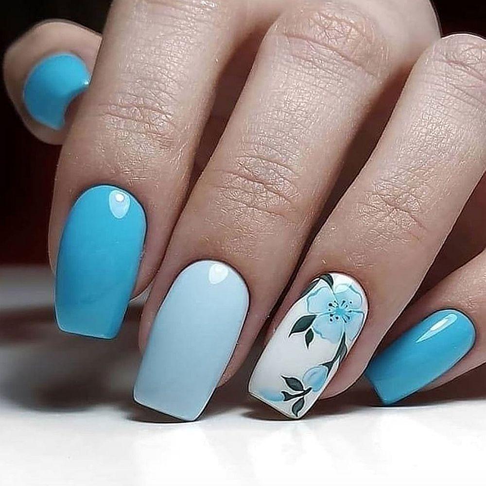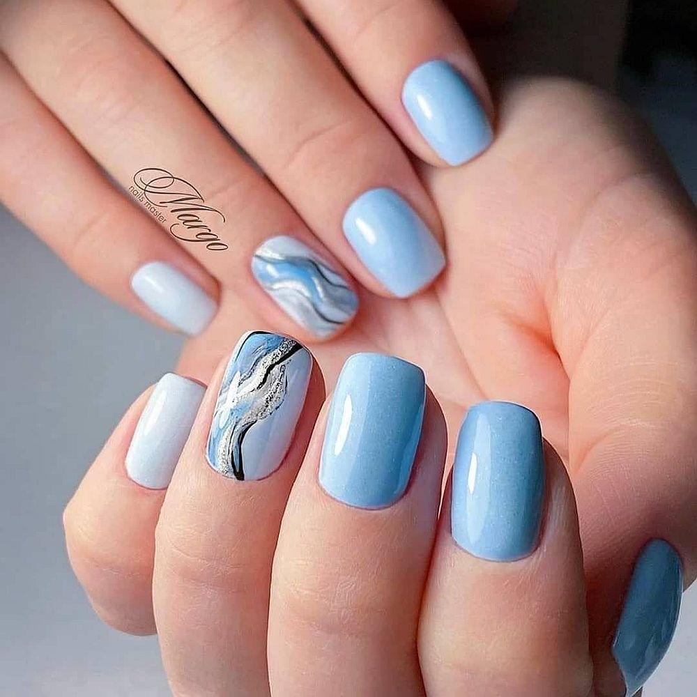 Нежно синий маникюр классный вариант для коротких ногтей. Этот универсальный цвет подойдет для создания праздничных луков, а также повседневных образов. При правильном дизайне можно создавать бесконечное количество вариаций.