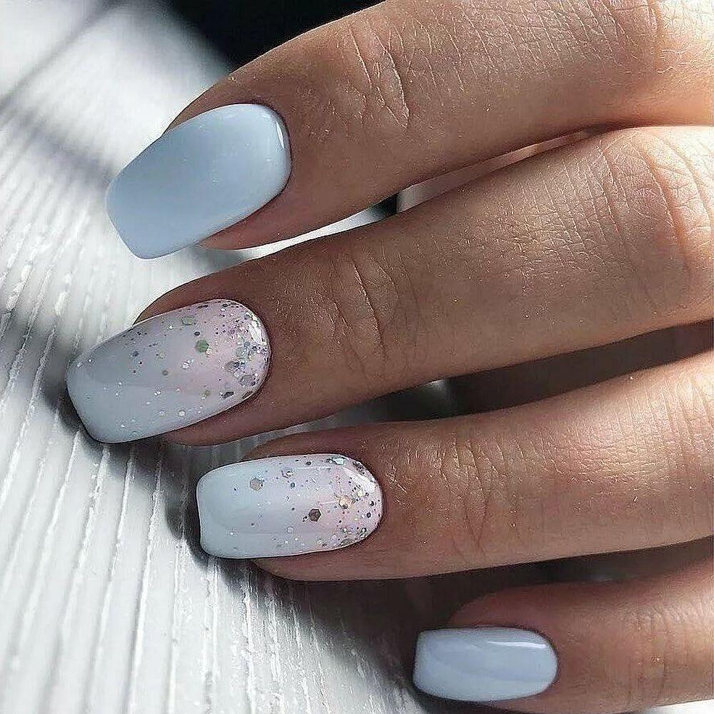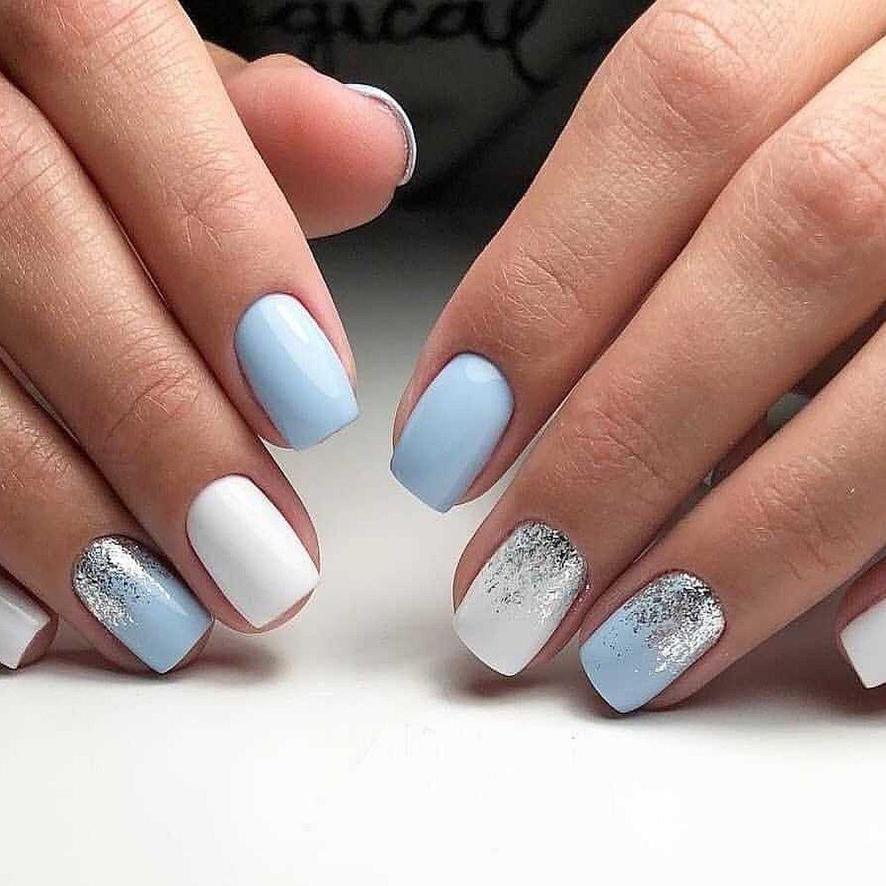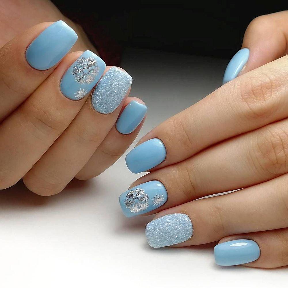 Все оттенки голубого станут прекрасной базой для нежного дизайна. Красивый дуэт с голубым создадут серебристая фольга, блёстки, втирка.