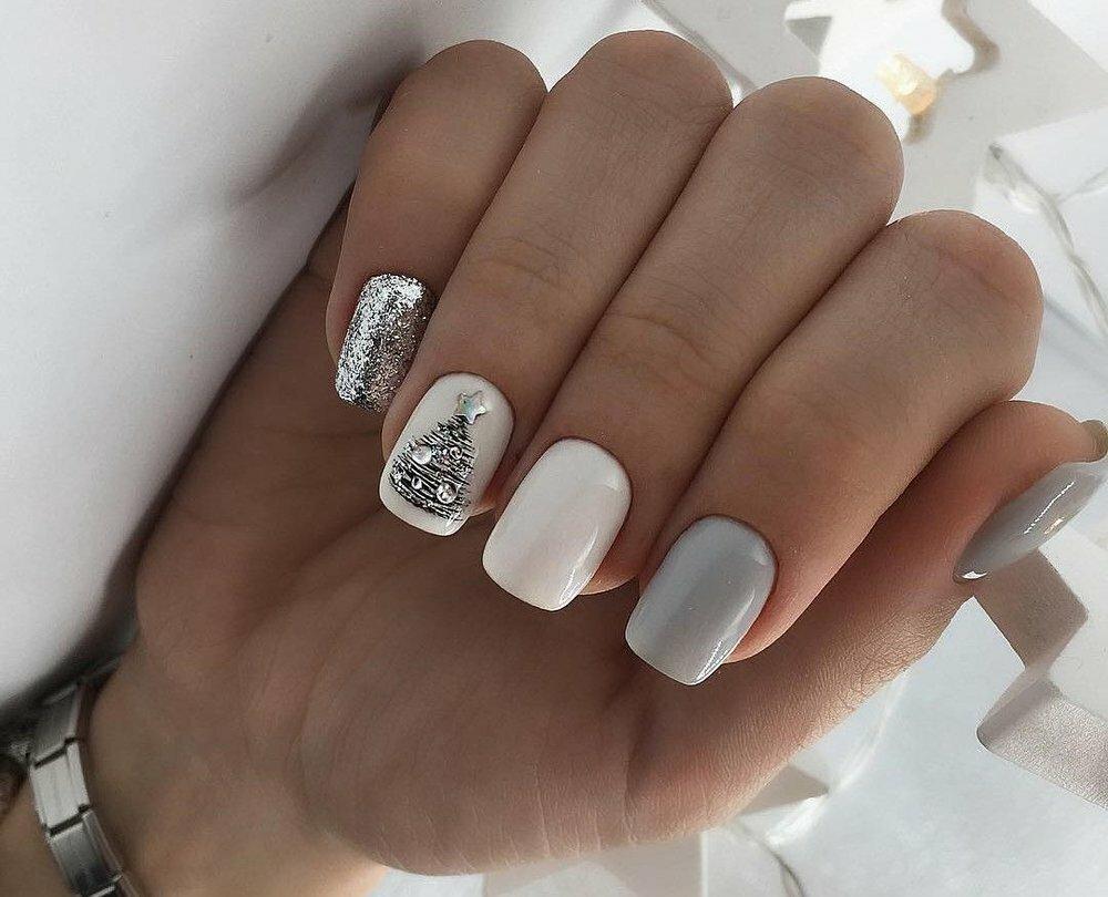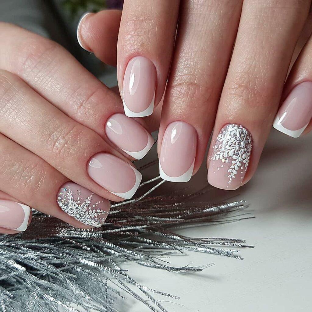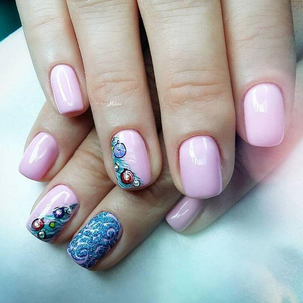 Не стоит думать, что новогодний маникюр предполагает обилие блеска, расписных картин и буйство красок. Этот дизайн можно вполне выполнить на небольшую длину пластины и в светлых тонах. Чтобы ногти не были скучны, его дополняют росписью, добавляют блеск или стразы, все по желанию клиента.