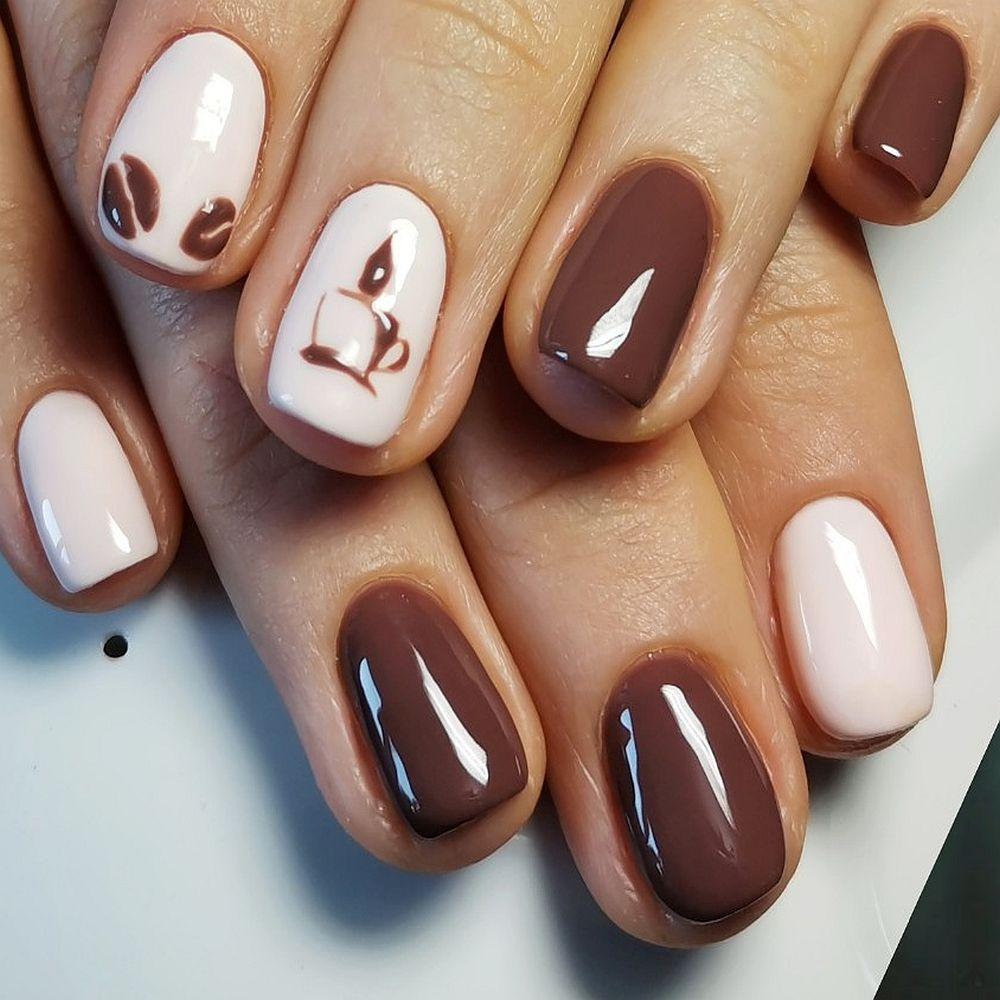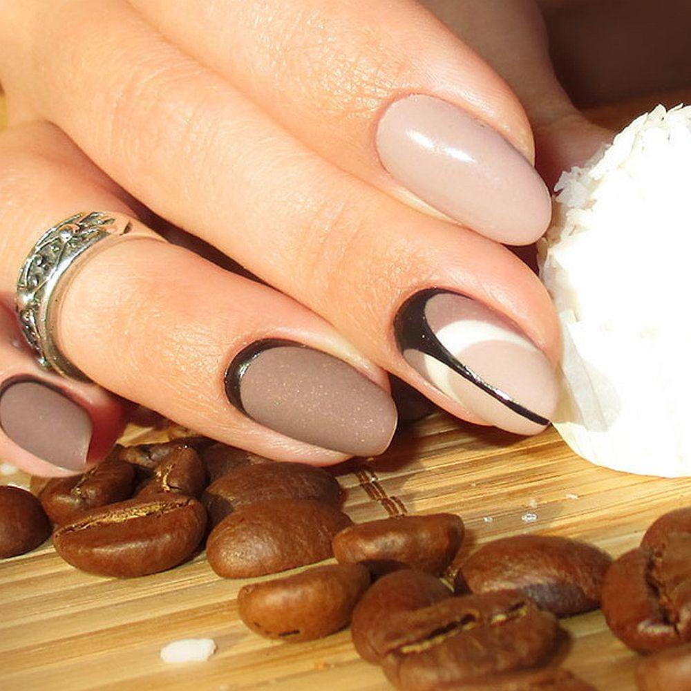 Кофейный маникюр дарит ощущения тепла и покоя. Неплохой вариант для повседневного образа. Коричневый гармонично смотрится сам по себе, а также в комбинации со стразами, блеском, рисунками.
