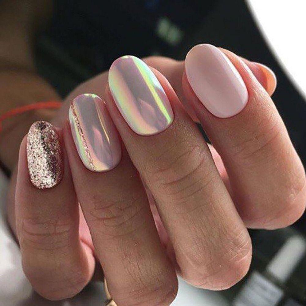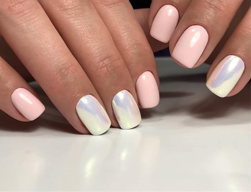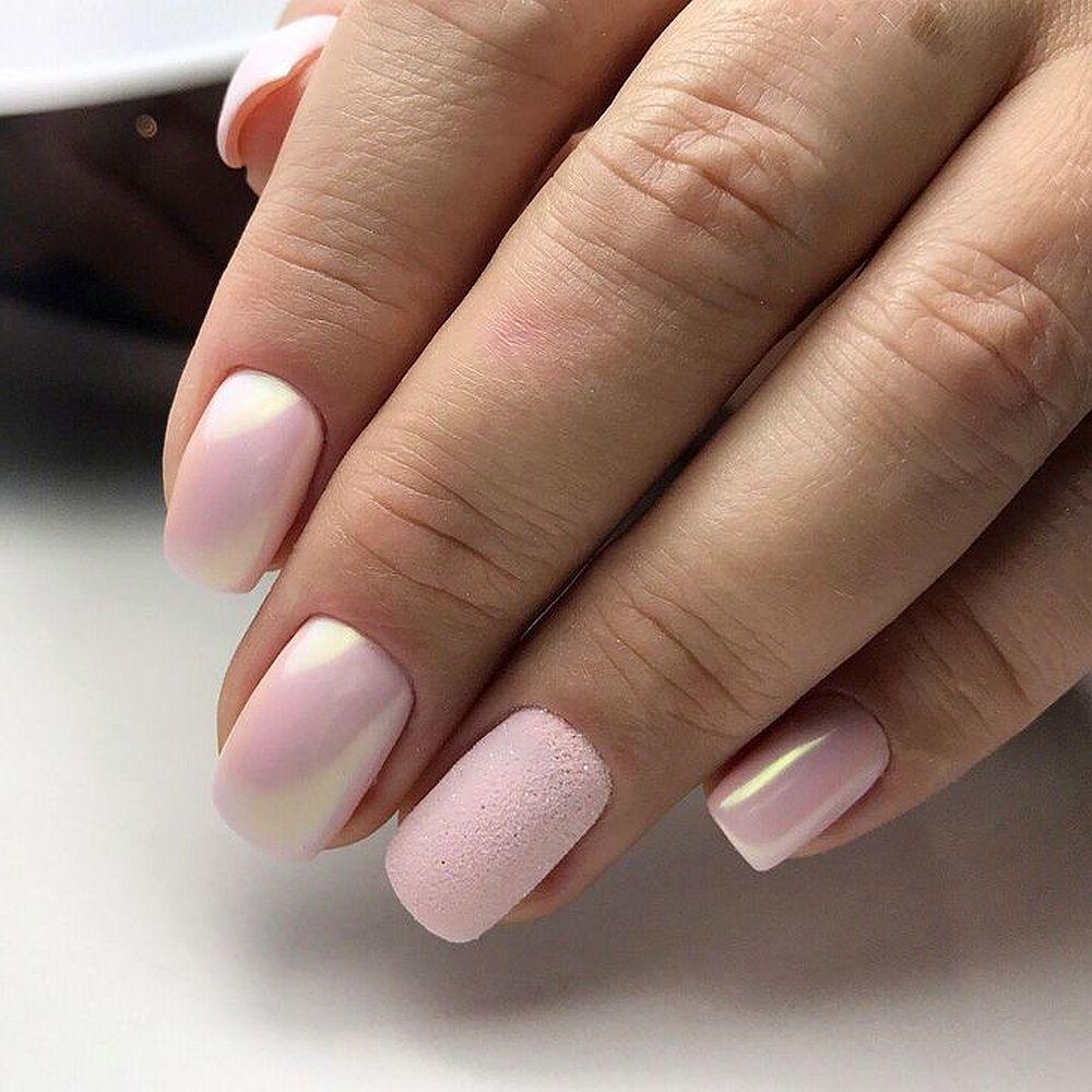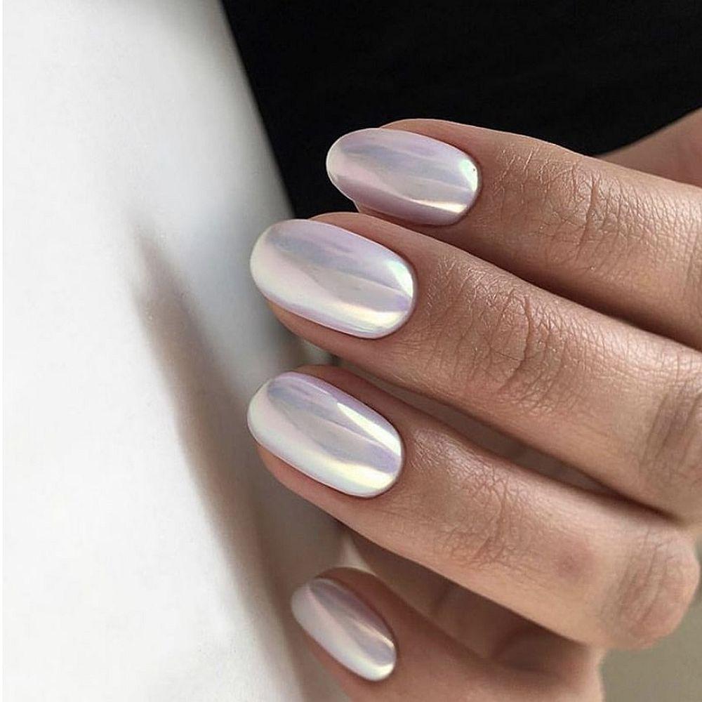 Модный светлый маникюр с жемчужной втиркой уже несколько сезонов остается популярным. Прелестный и очень нежный вариант светлых тонов с переливом придется по вкусу многим.