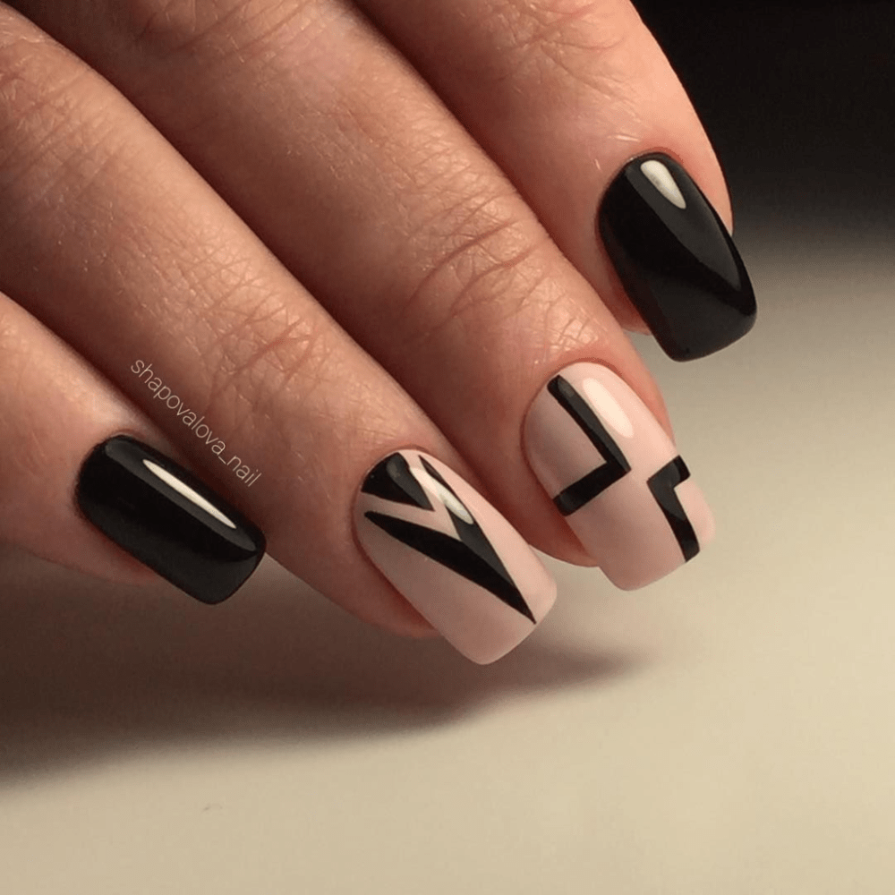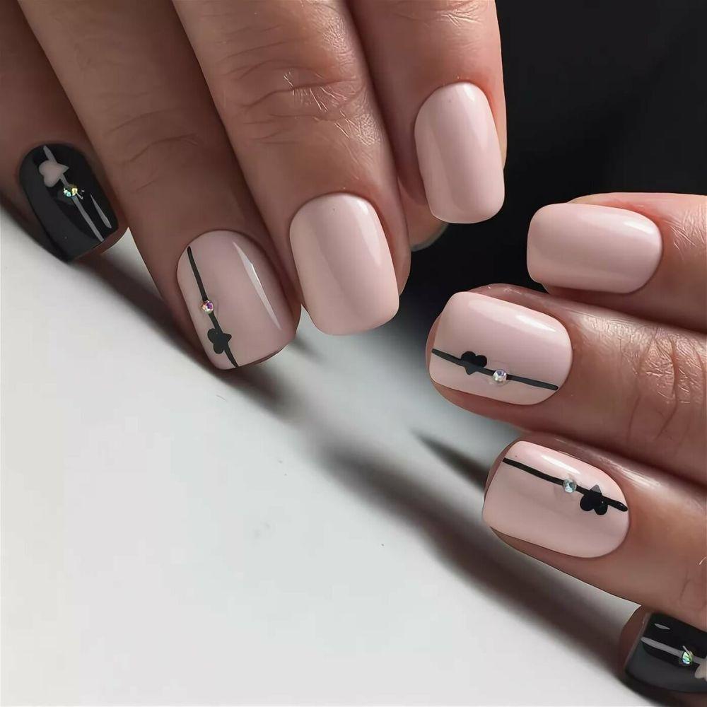 Дизайн ногтей претерпел множество изменений, и сейчас в нежном маникюре присутствует даже черный цвет. Он отлично сочетается с нежно-розовым. Изящно смотрятся следующие варианты: молочный с черным и белый во франче.