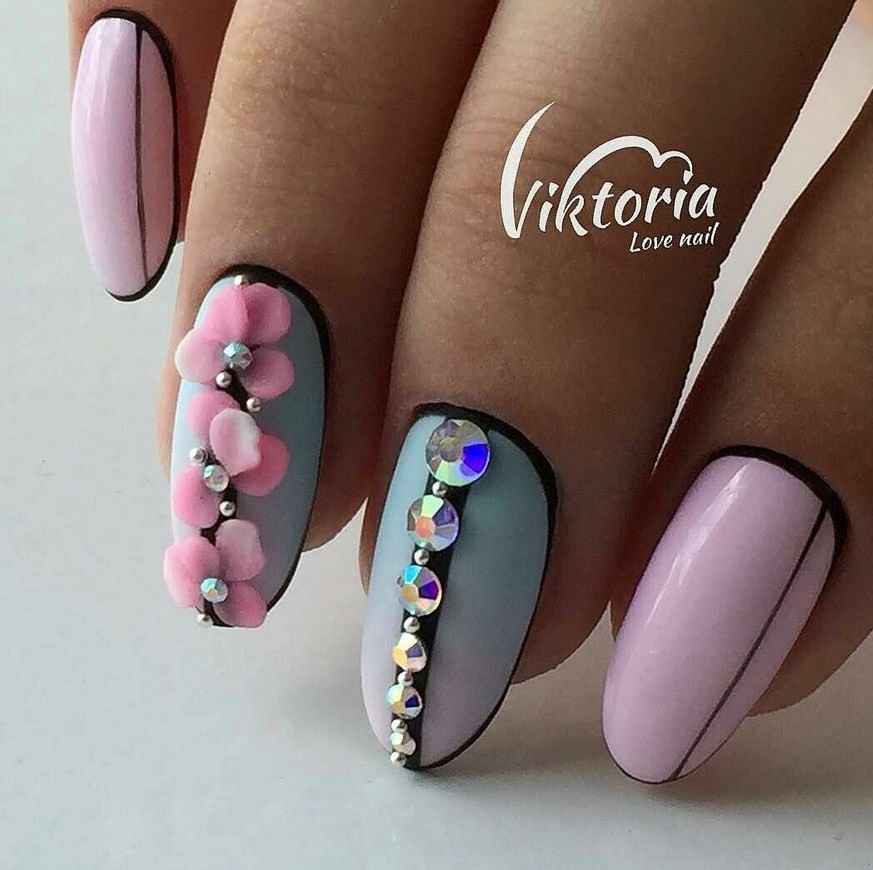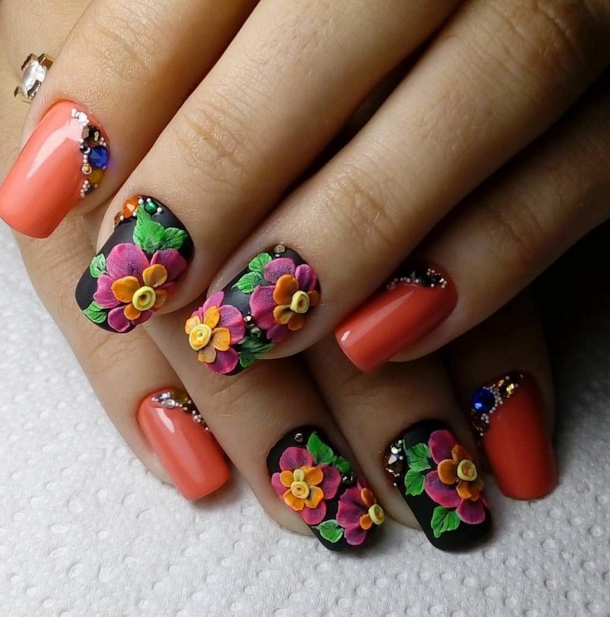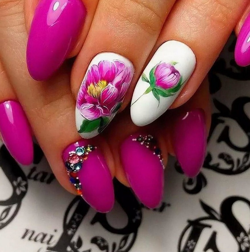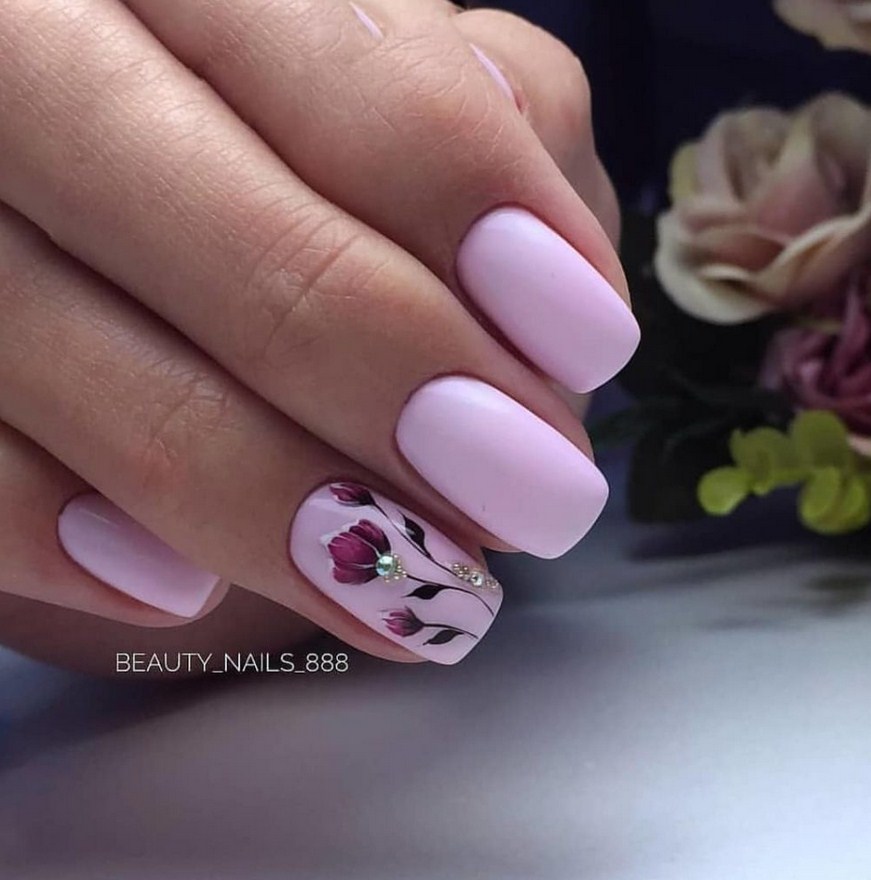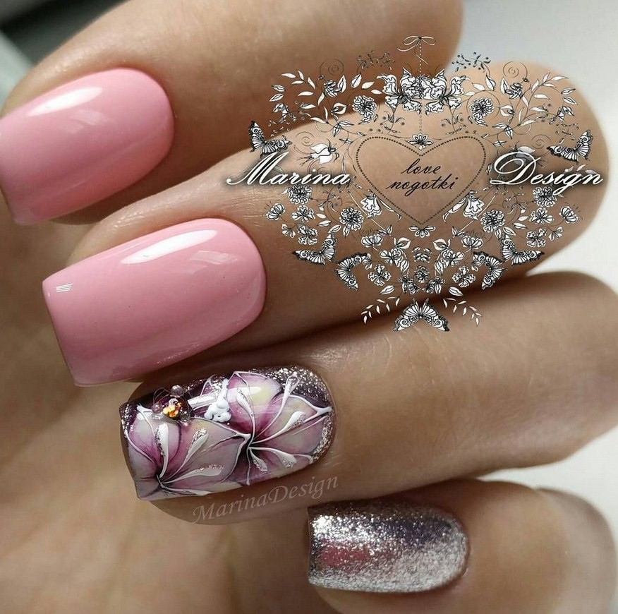 Мы уже отмечали, что цветочный маникюр подходит для разной длины ноготков. Но стоит учесть некоторые нюансы, чтобы не сделать дизайн чрезмерным. Особенно это касается ситуаций, когда нейл-мастер или модница сочетают несколько техник. Например, рисунок цветов и стразы, блестки и др.