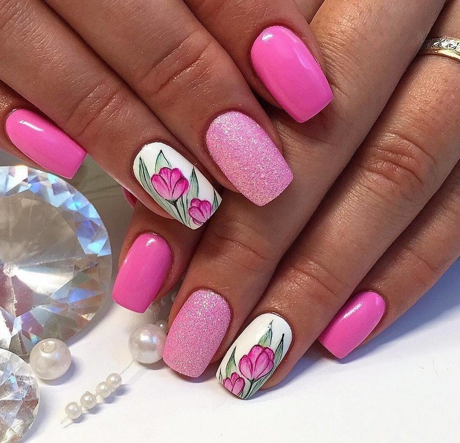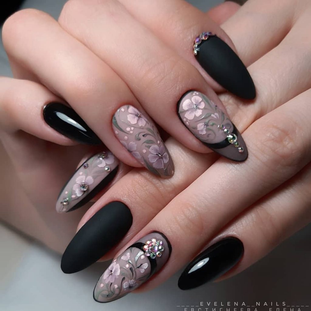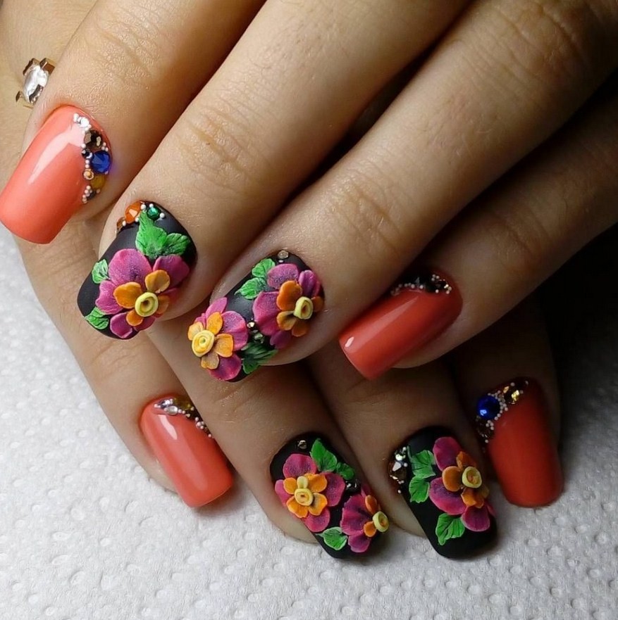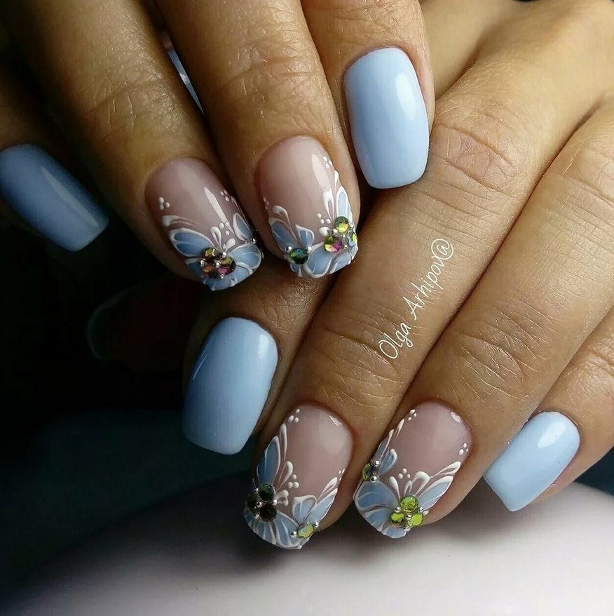 Мы уже отмечали, что цветочный маникюр подходит для разной длины ноготков. Но стоит учесть некоторые нюансы, чтобы не сделать дизайн чрезмерным. Особенно это касается ситуаций, когда нейл-мастер или модница сочетают несколько техник. Например, рисунок цветов и стразы, блестки и др.
