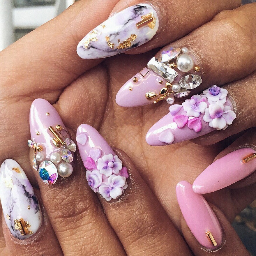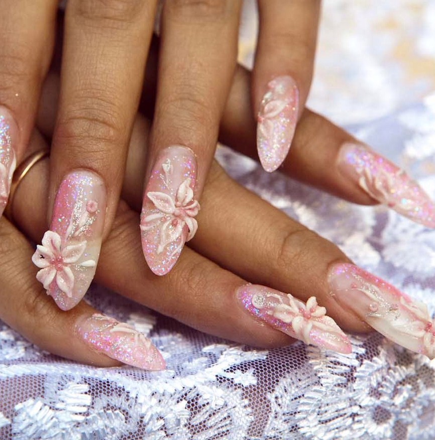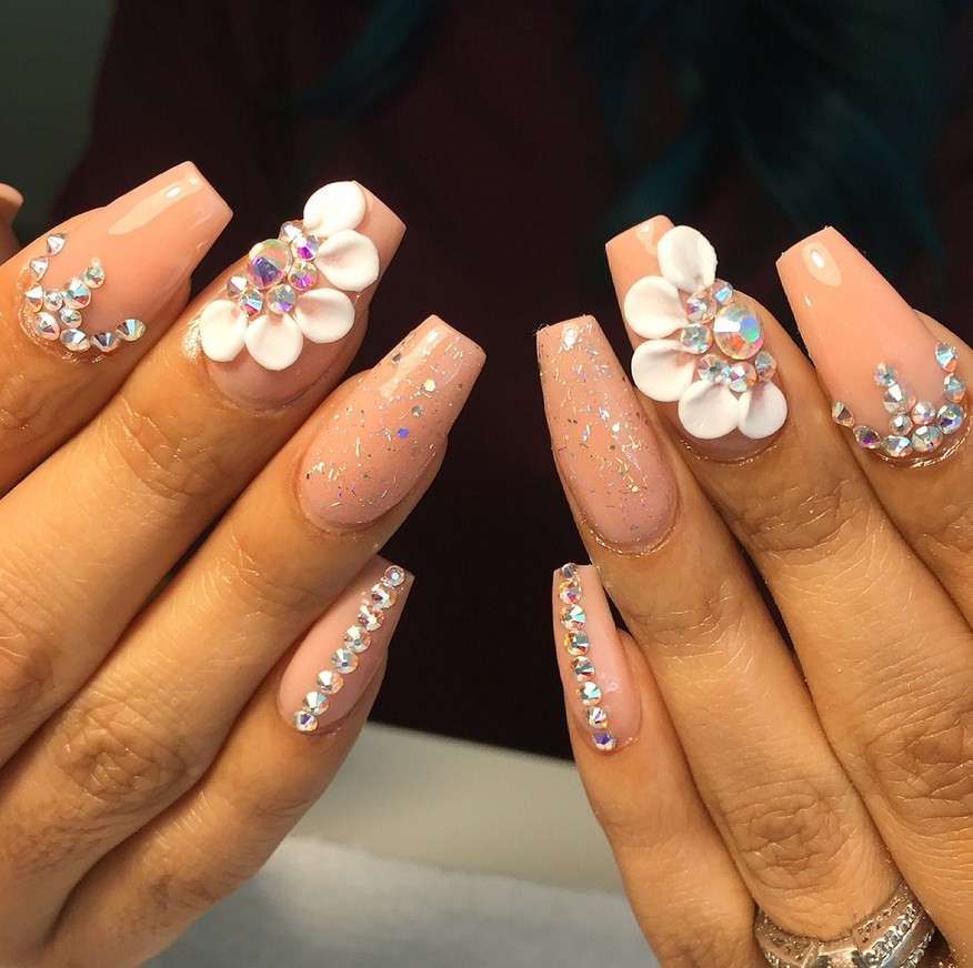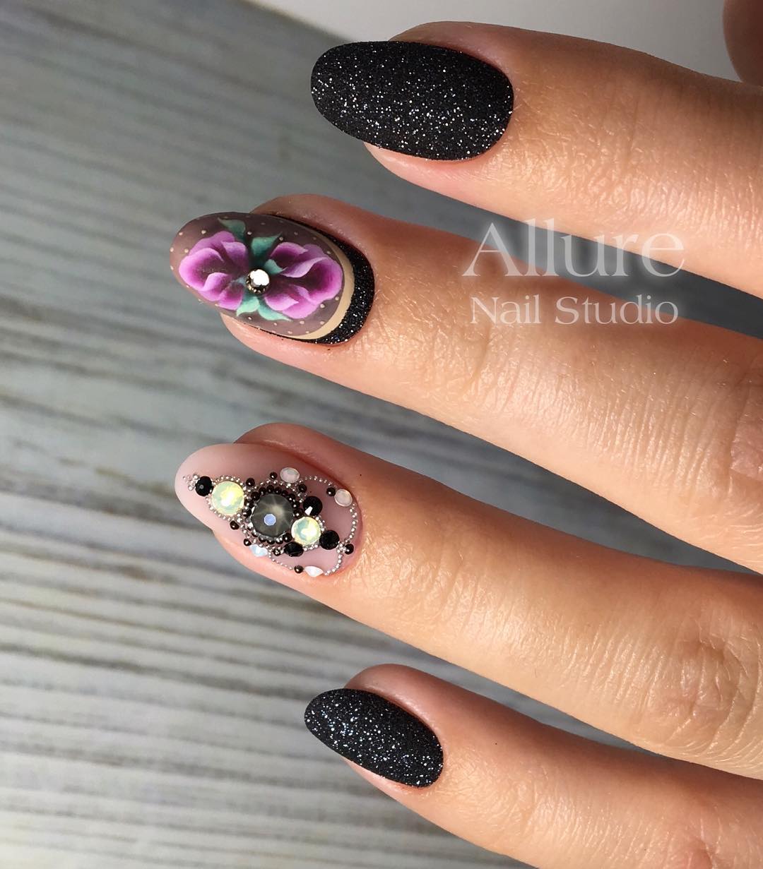 Если скомбинировать цветы и блестки, сможете создать неповторимый нейл-арт, который будет уместно смотреться на вечеринках и торжествах. Вместо классических стразов воспользуйтесь камнями или хрустальной крошкой.