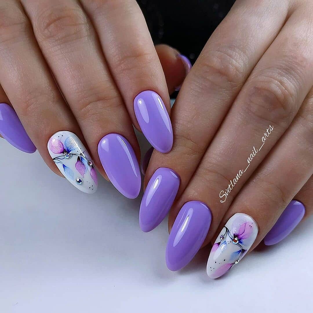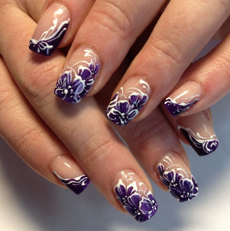 Возьмите коричневый цвет и, начав с темного у основания ногтя, постепенно переходите к молочному на его кончике. Разделите ноготь на две половинки, одну закрасьте фиалковым цветом, другую украшайте в технике «градиент» или «омбре» с плавным переходом оттенков фиолетового.
