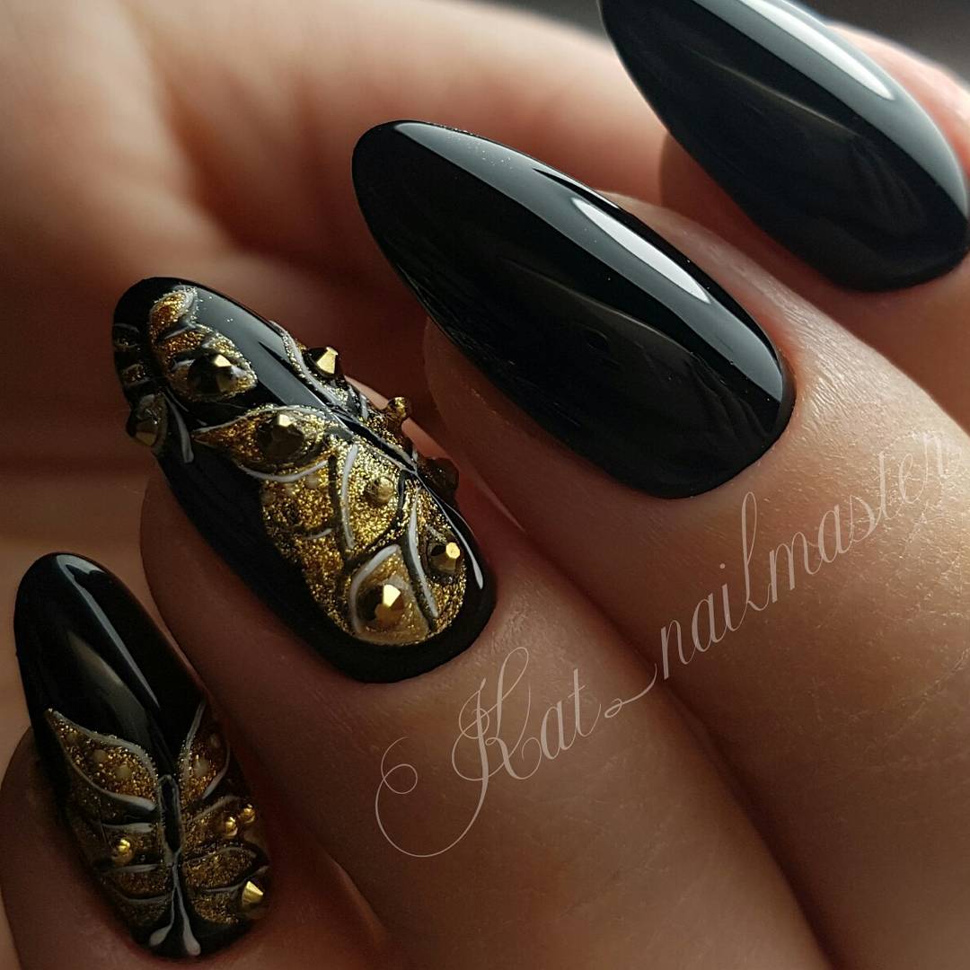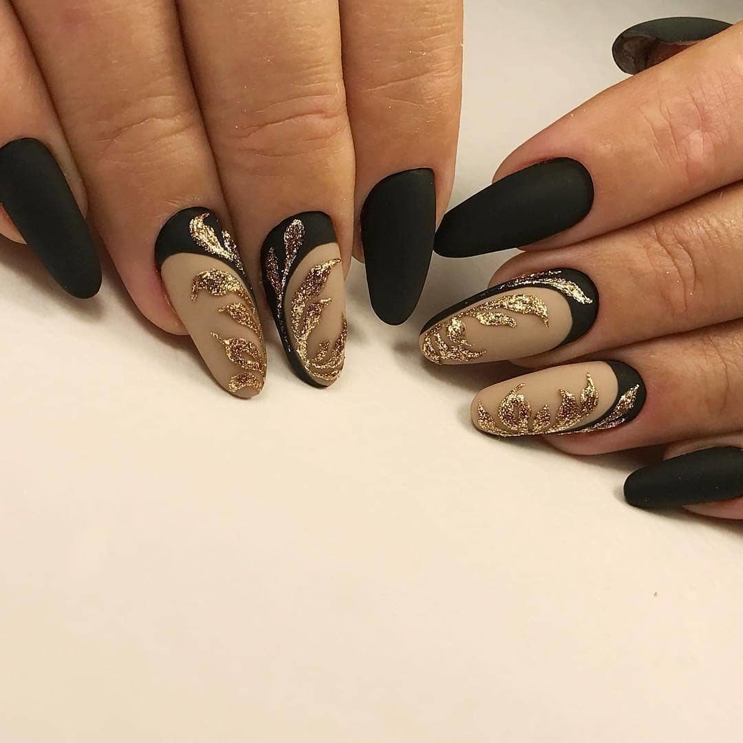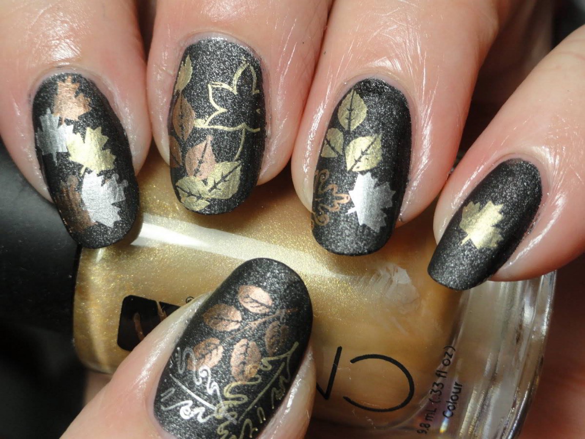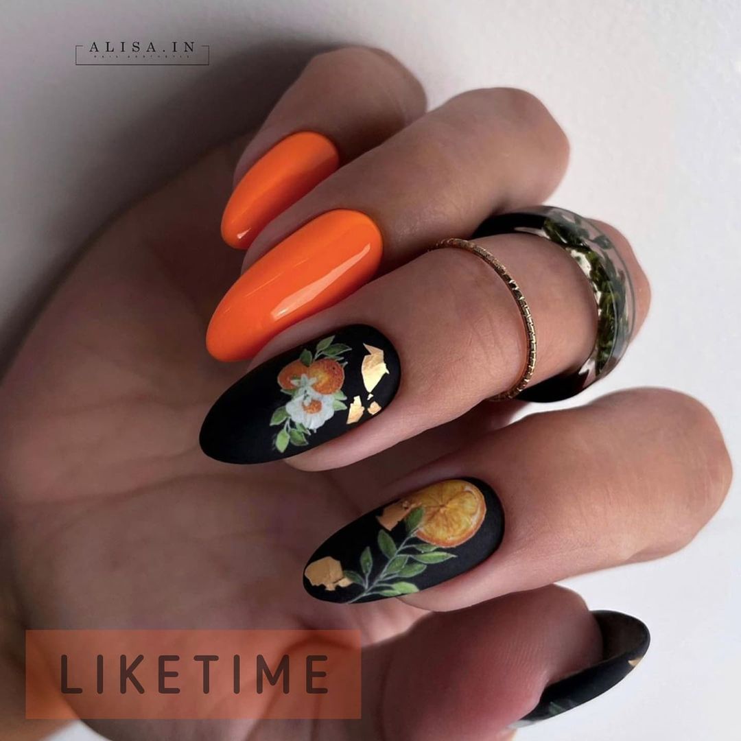 Черный дизайн стерпит любые эксперименты. На черном фоне великолепно выглядят геометрические узоры, цветы, контрастные узоры желтым, белым, золотым цветом. Вот и с осенними листьями черный маникюр нашел много общего