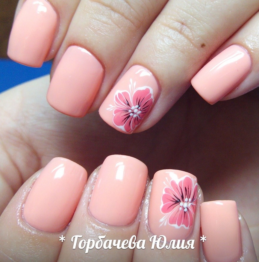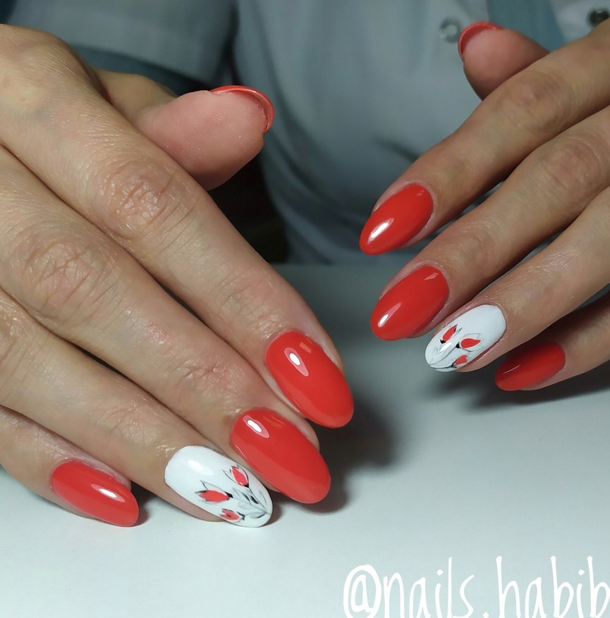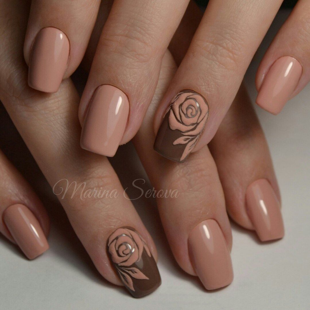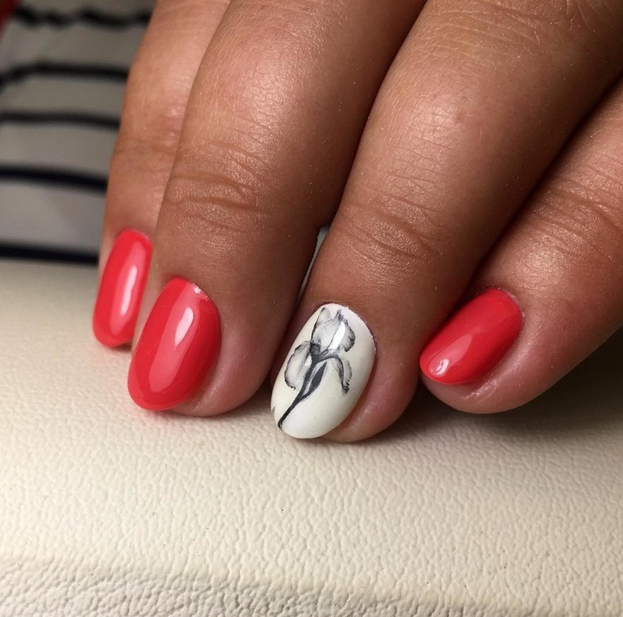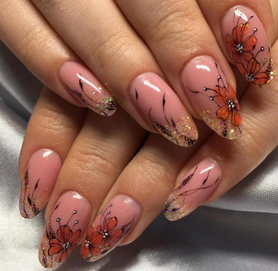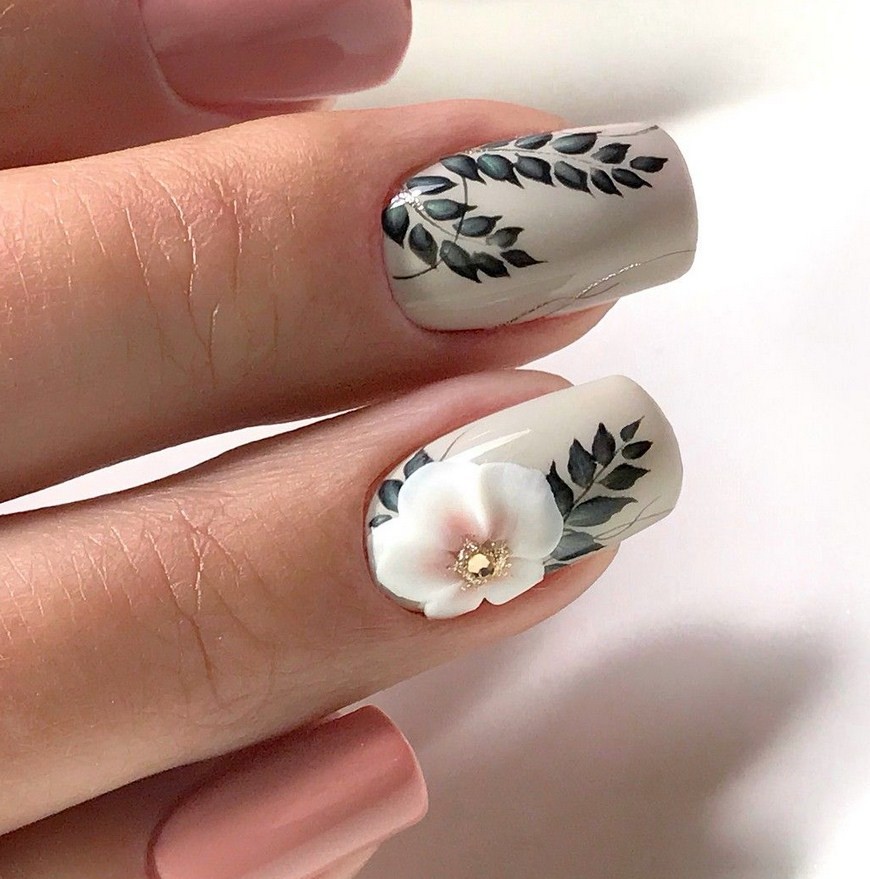- Перекличка цветов и цвета. Если лепестки горчичные, ноготь соседнего пальца можно покрасить тон в тон. Или на нюдовом бежевом фоне использовать яркие алые цветки, но только на одном пальце, на остальных — оставить нейтральные тона.