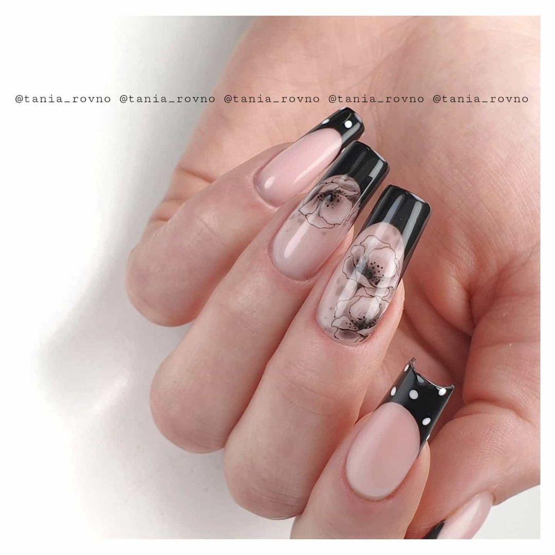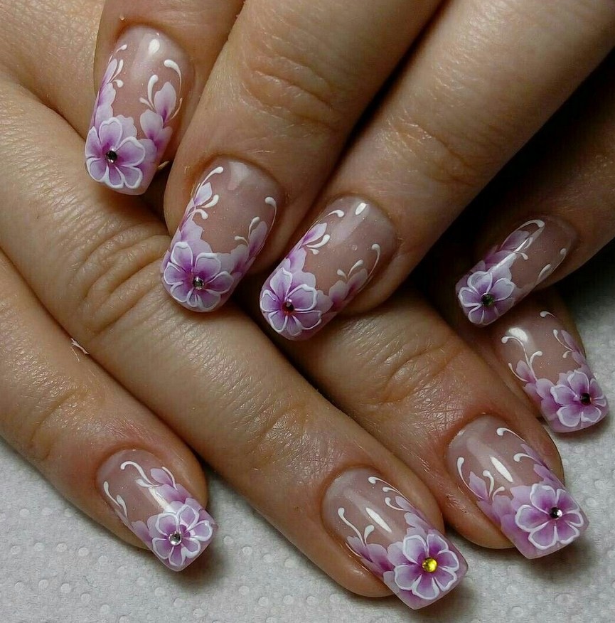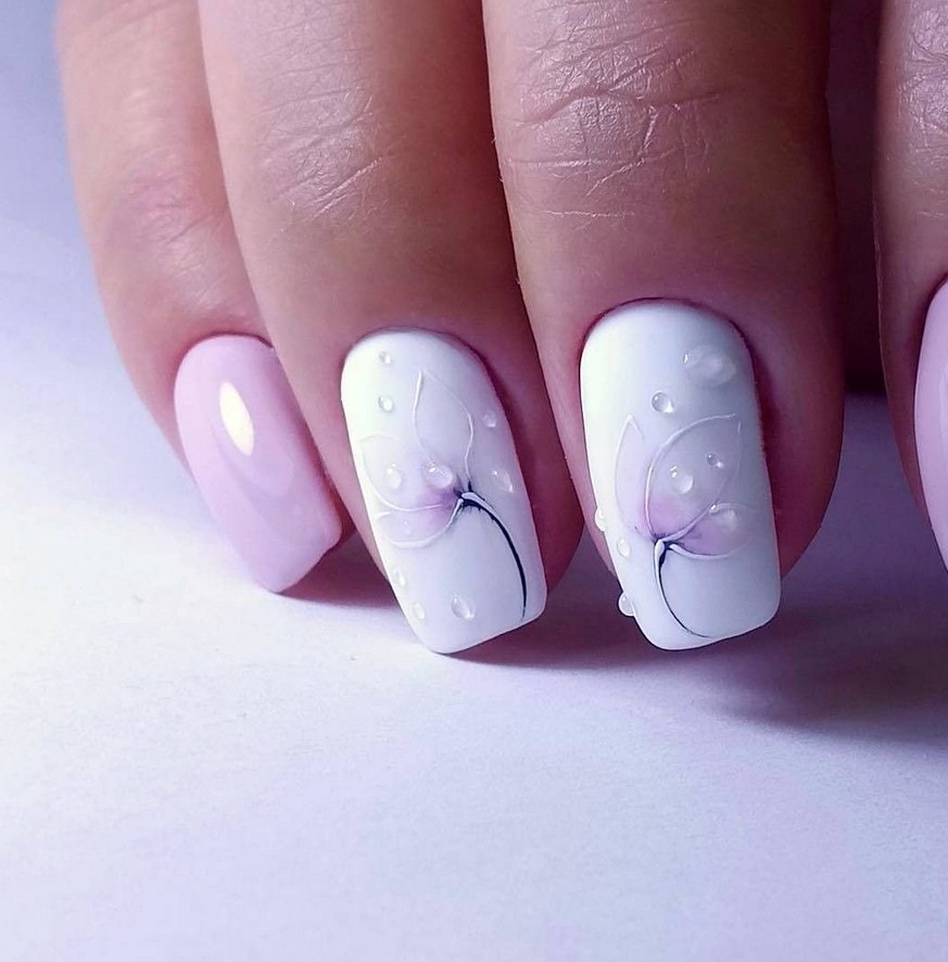 - Прозрачная основа. Это мейнстрим в данном направлении. Касается любой длины ногтей. Много мелких цветочков на полностью прозрачном фоне смотрится действительно завораживающе, они будто парят в невесомости.