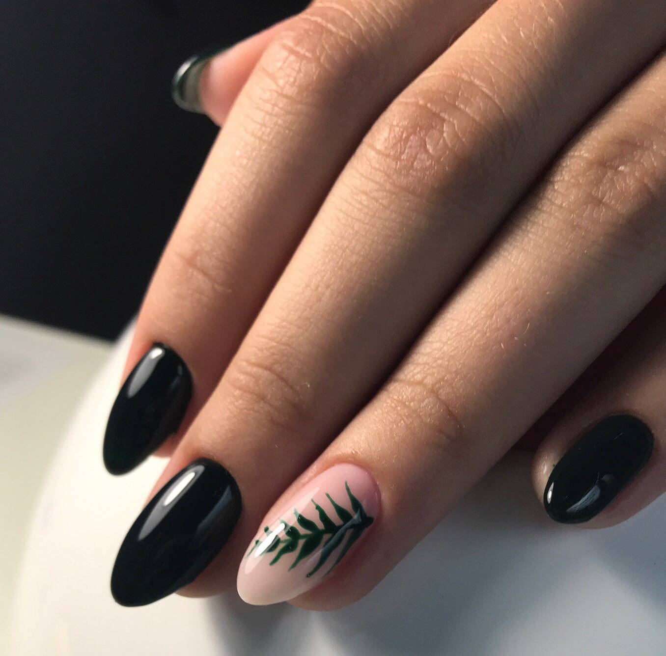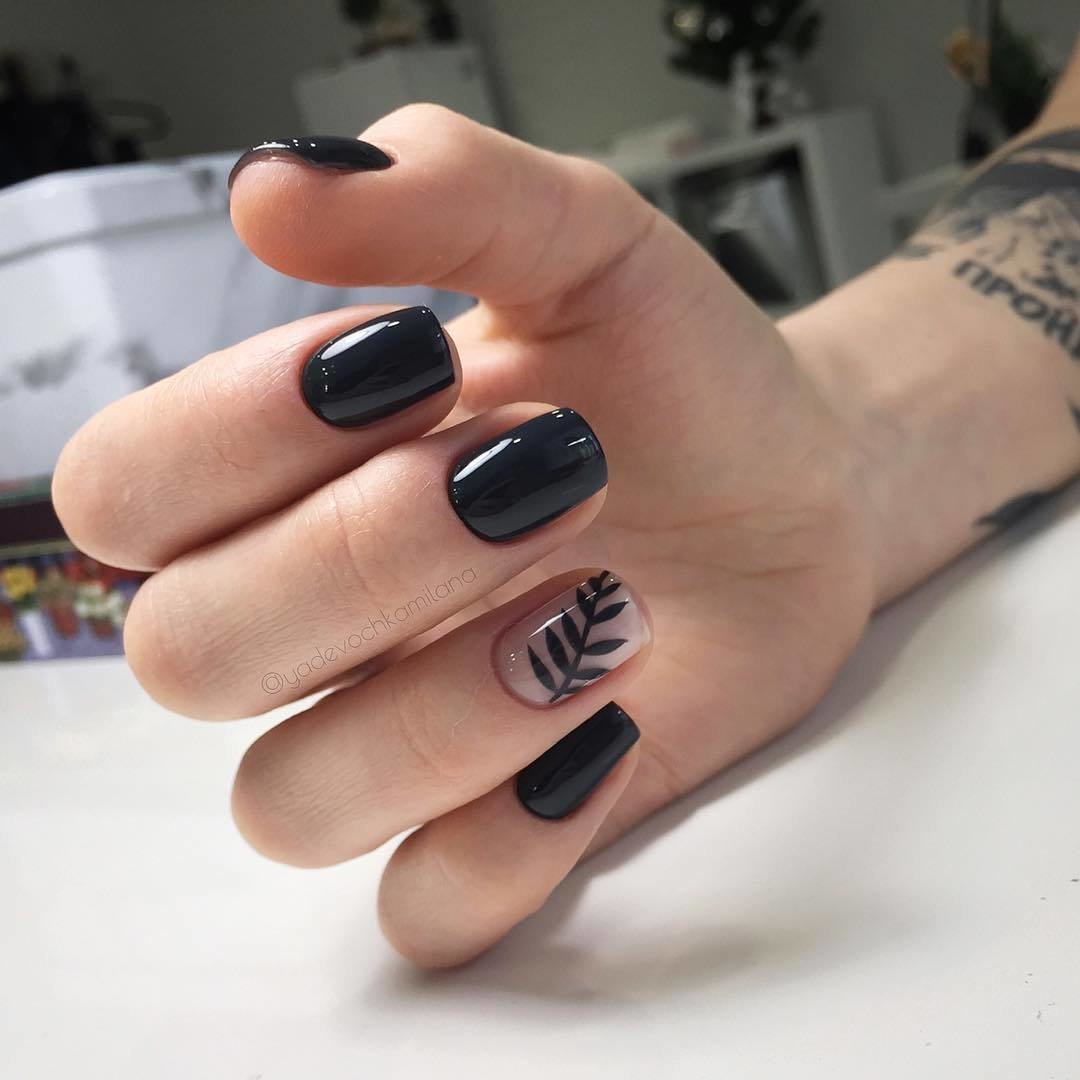 Кроме того черный маникюр с листьями может быть выполнен исключительно в одном цвете. При этом листья прорисовываются на светлом фоне или прозрачной матовой поверхности