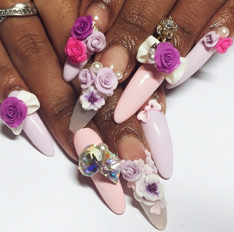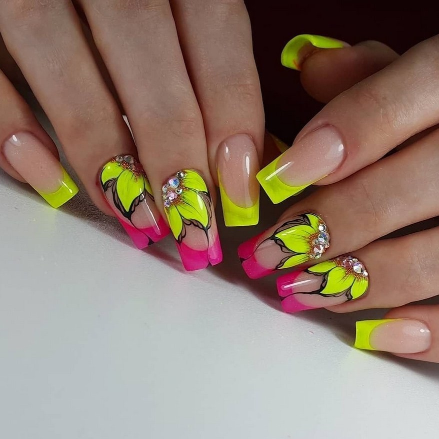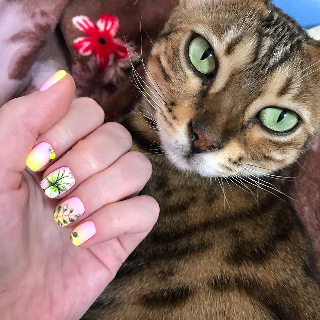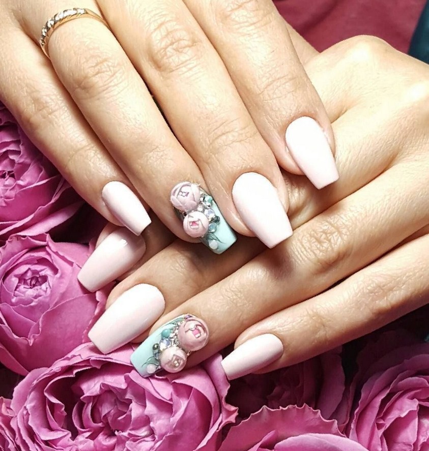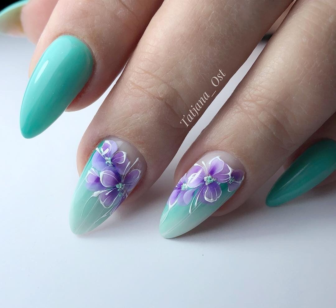 При большой длине стоит обратить внимание на то, что крупные цветы могут сделать и без того длинную пластину еще более длинной. Кстати, для таких ноготков тоже подходит актуальный тренд на мелкие цветочки