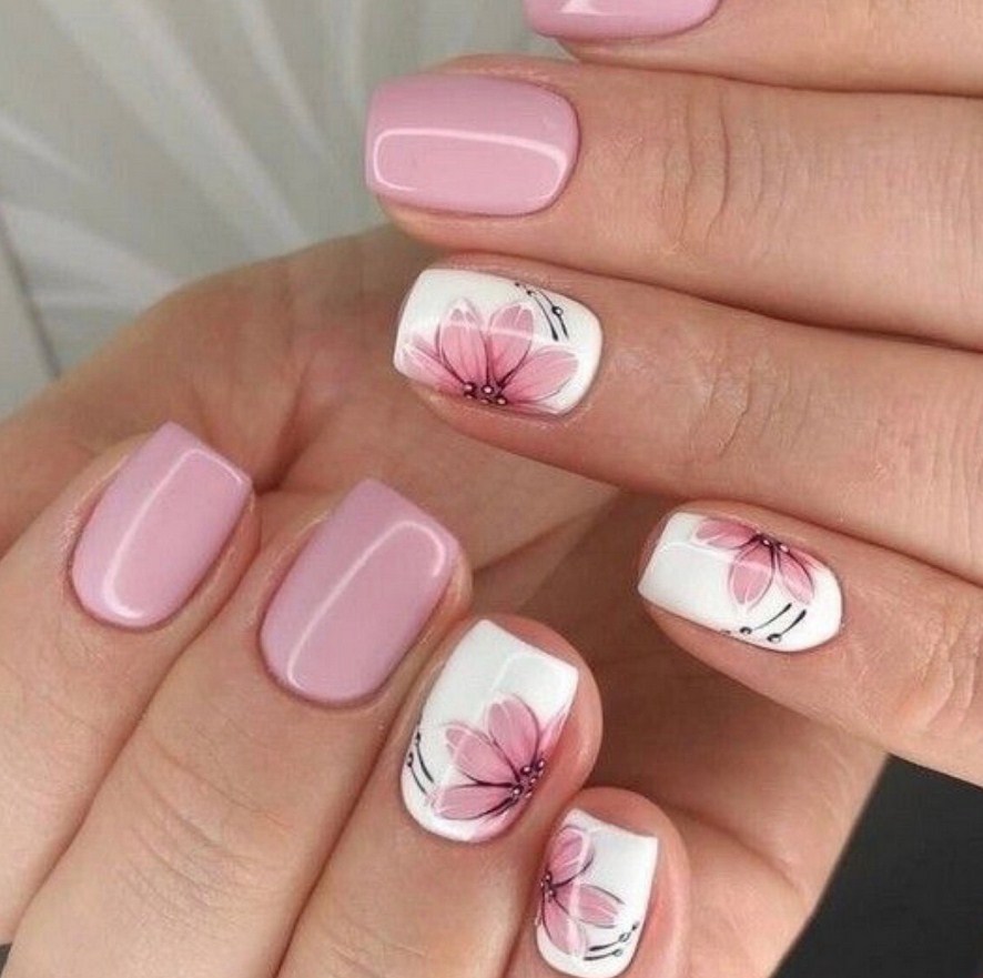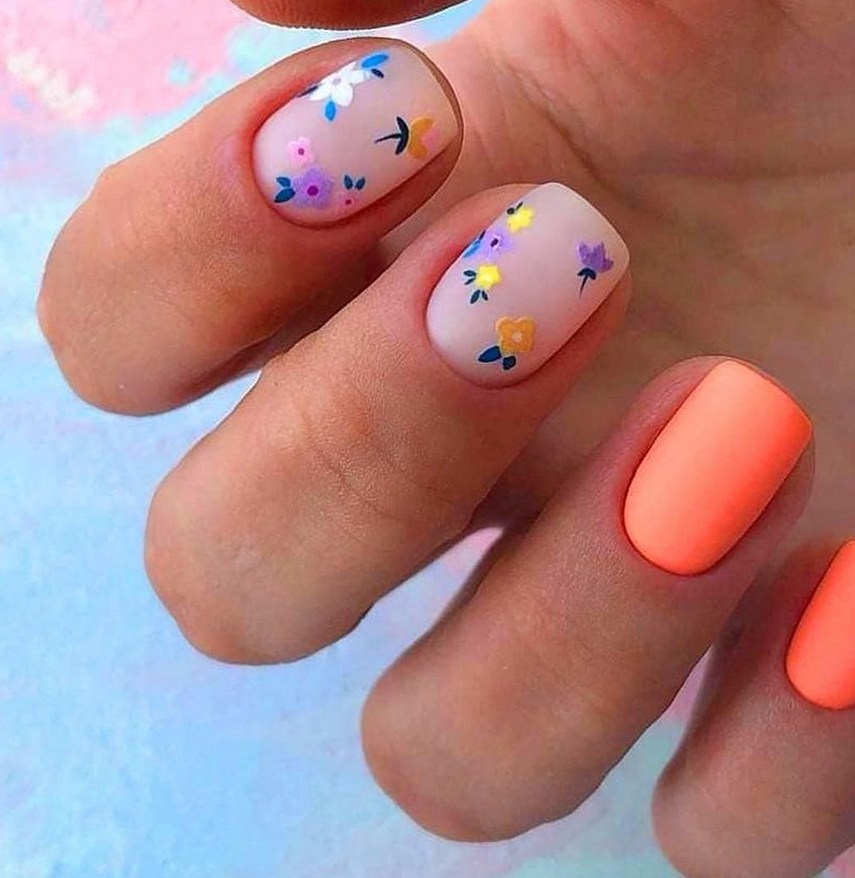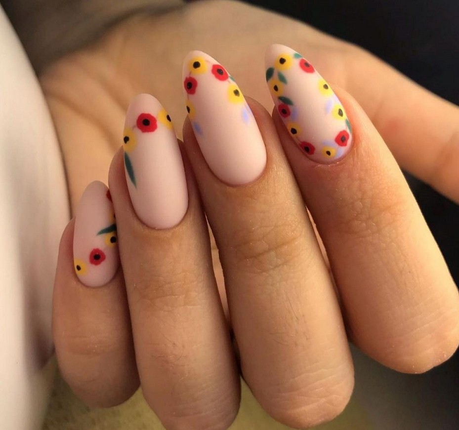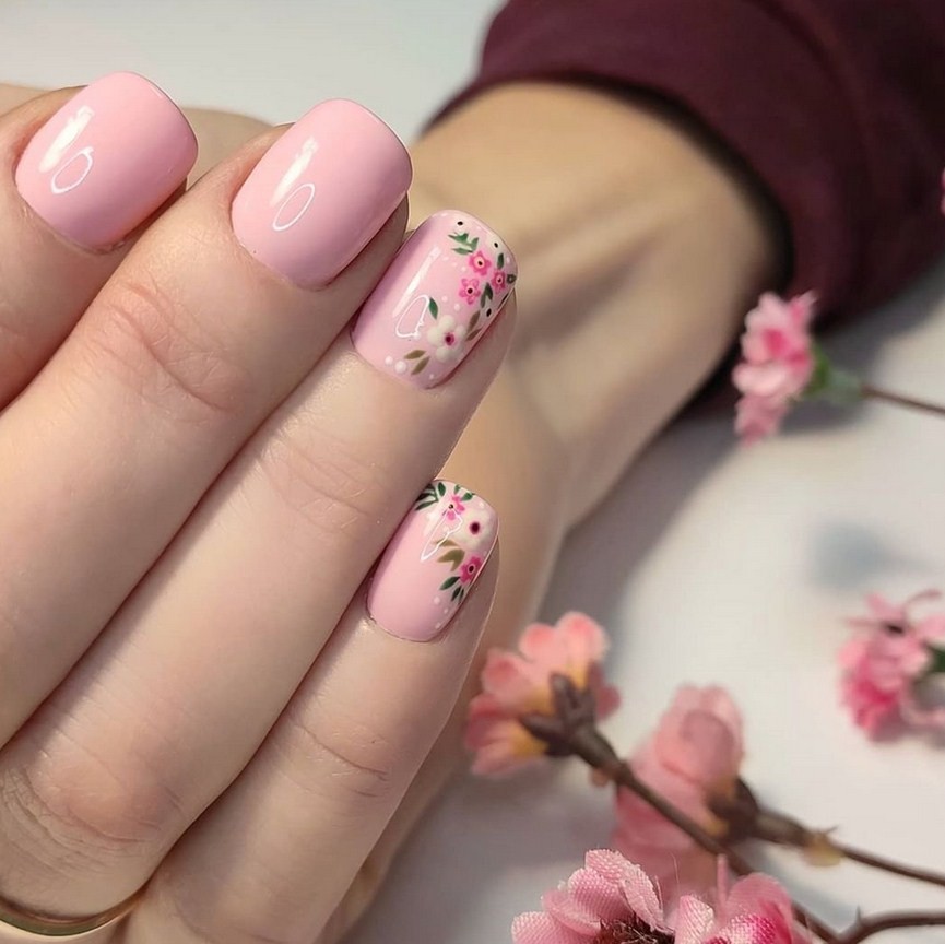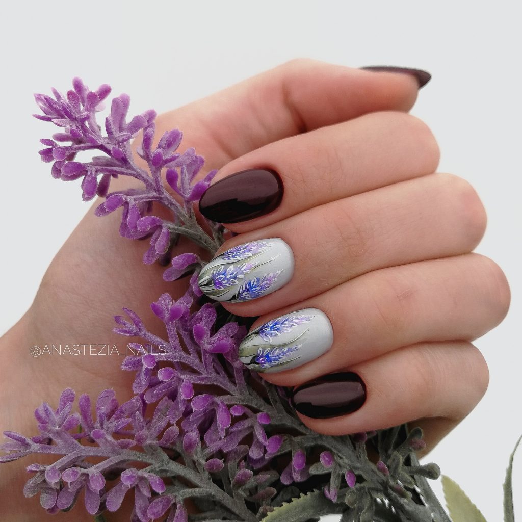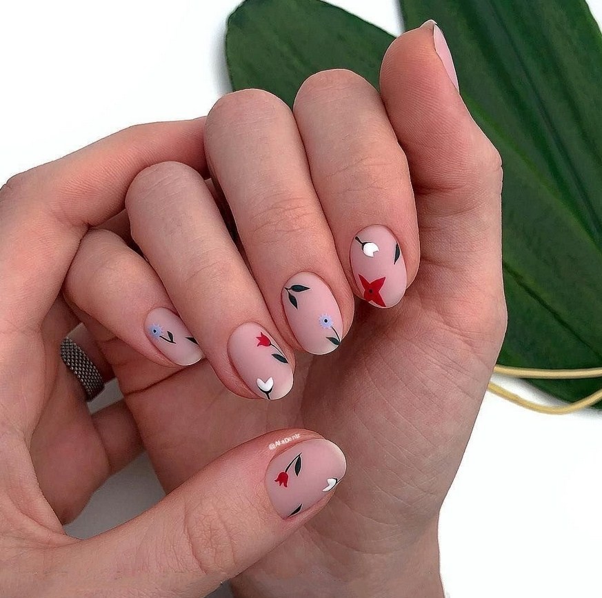 Для коротких ногтей лучше использовать рисунок мелких полевых цветов. Крупные варианты не подходят. Исключение — вы решили сделать акцент на единственном ноготке