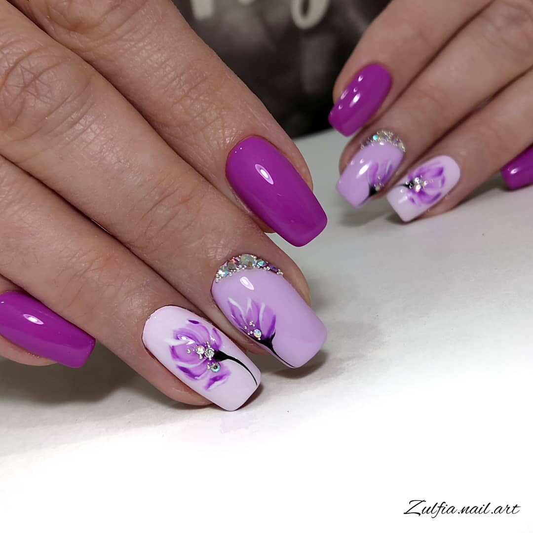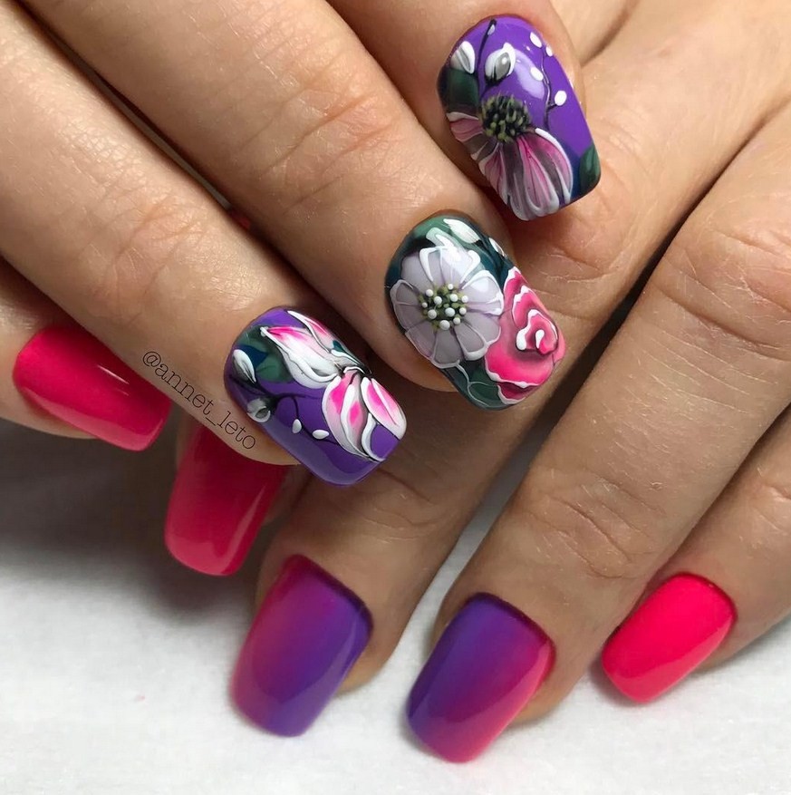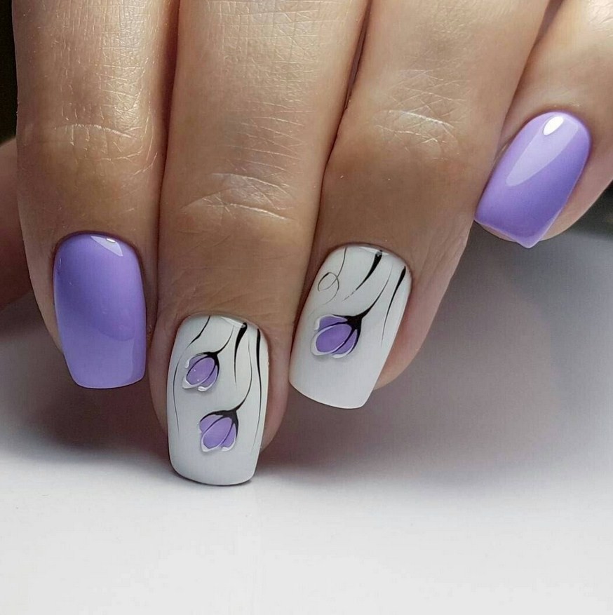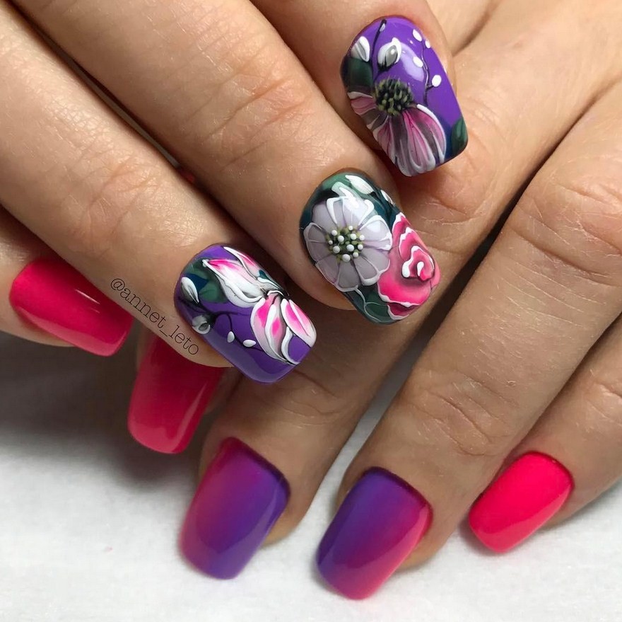 Цветочный маникюр на форму квадрат имеет свои нюансы. Это довольно активная форма, которую выбирают деловые и решительные дамы. Многим кажется, что романтический дизайн плохо монтируется с острыми уголками и широкой пластиной. Это не так. Цветы отлично подходят для такой формы. Но лучше выбирать тщательно прорисованные четкие линии. Например, маникюр с веточками лаванды на молочной базе, мелкие анютины глазки на матовом топе или яркие ромашки на зеленом глянцевом покрытии.