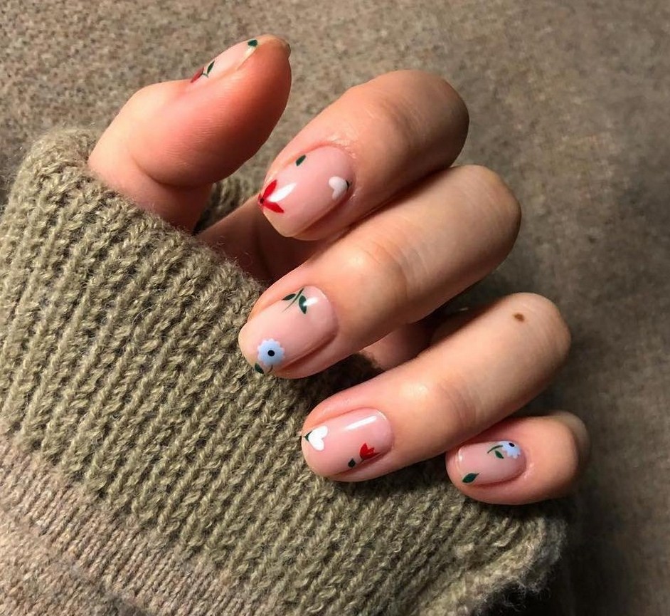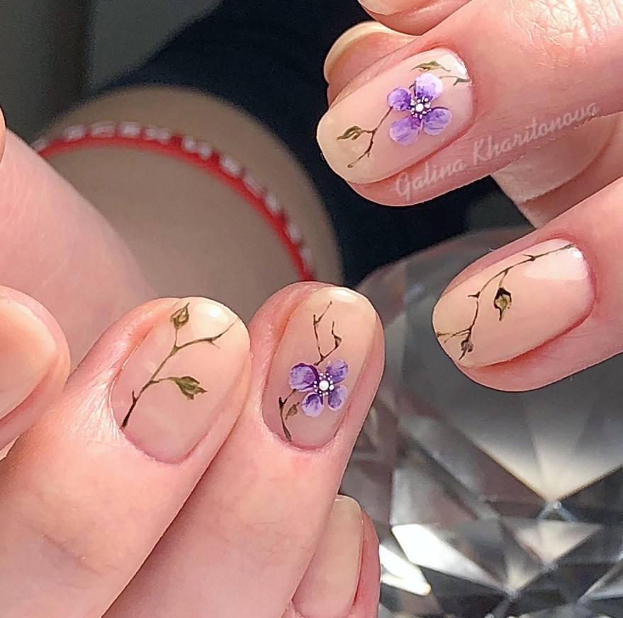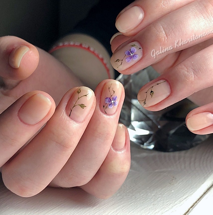 Обратите внимание на тренд сезона 2024 — мелкие полевые цветочки без листочков на коротких ногтях. Для базы лучше выбрать прозрачный лак, молочный или нюдовый оттенок
