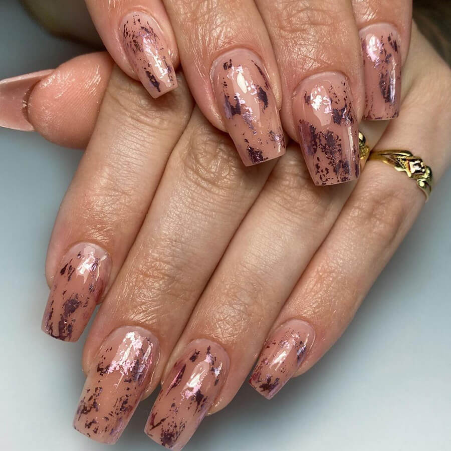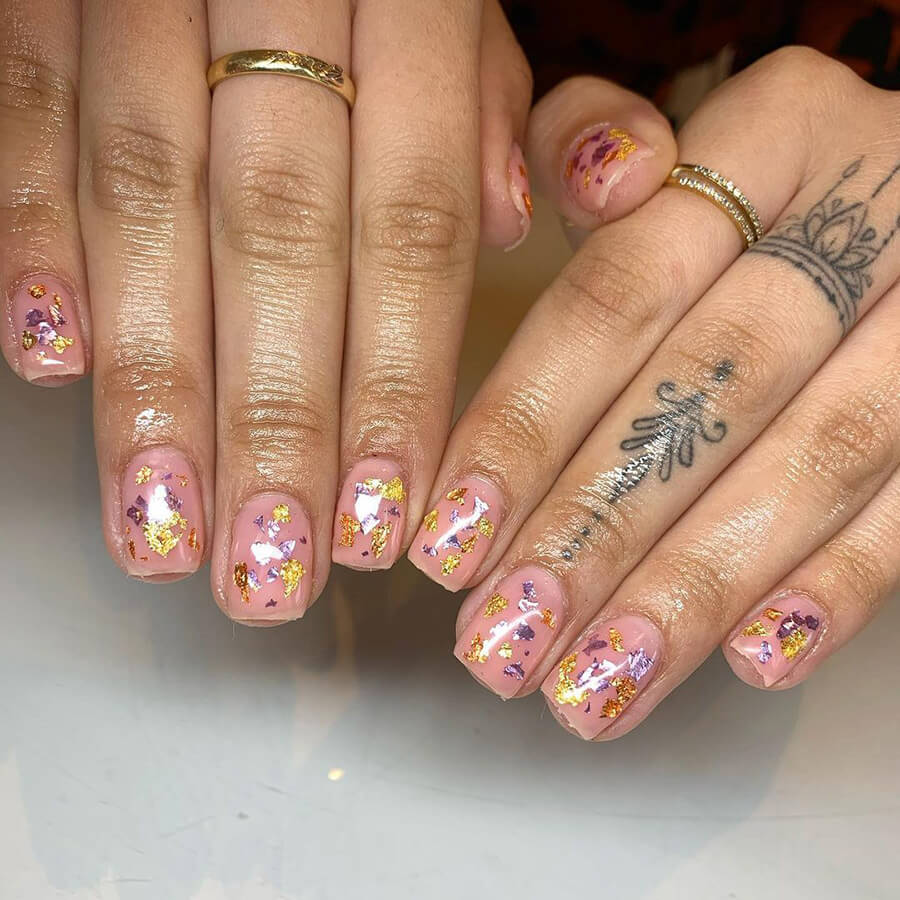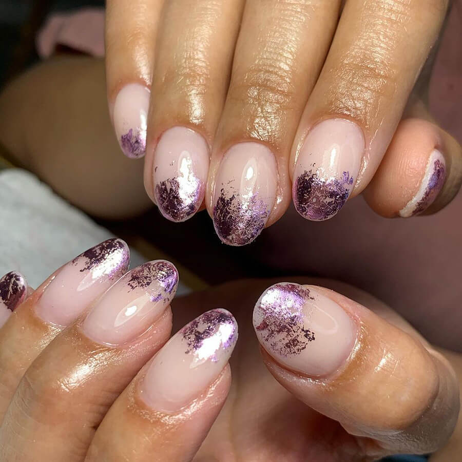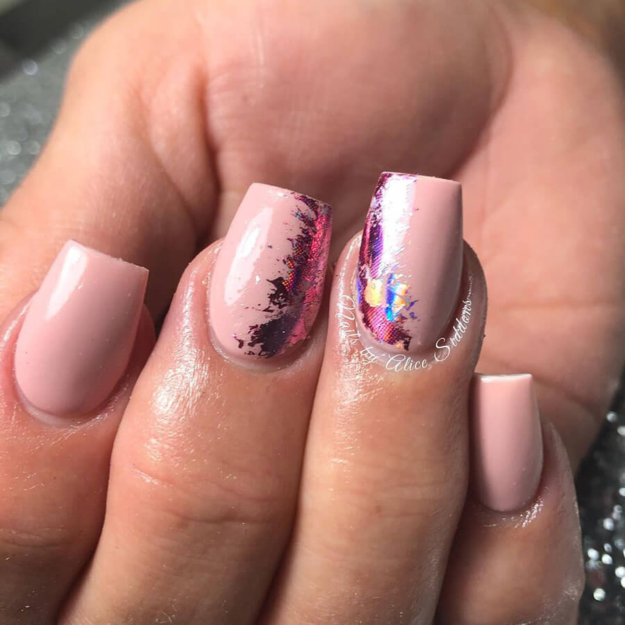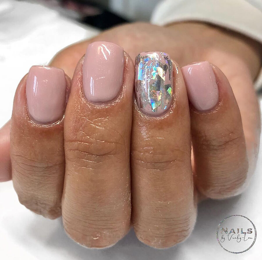 - романтичный вариант с нюдом, пастельным или бесцветным покрытием, сверху которого беспорядочно накладываются фольгированные осколки.