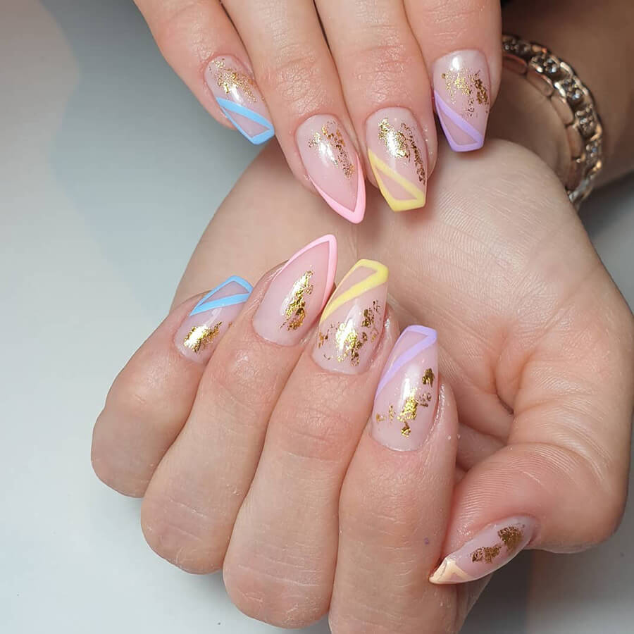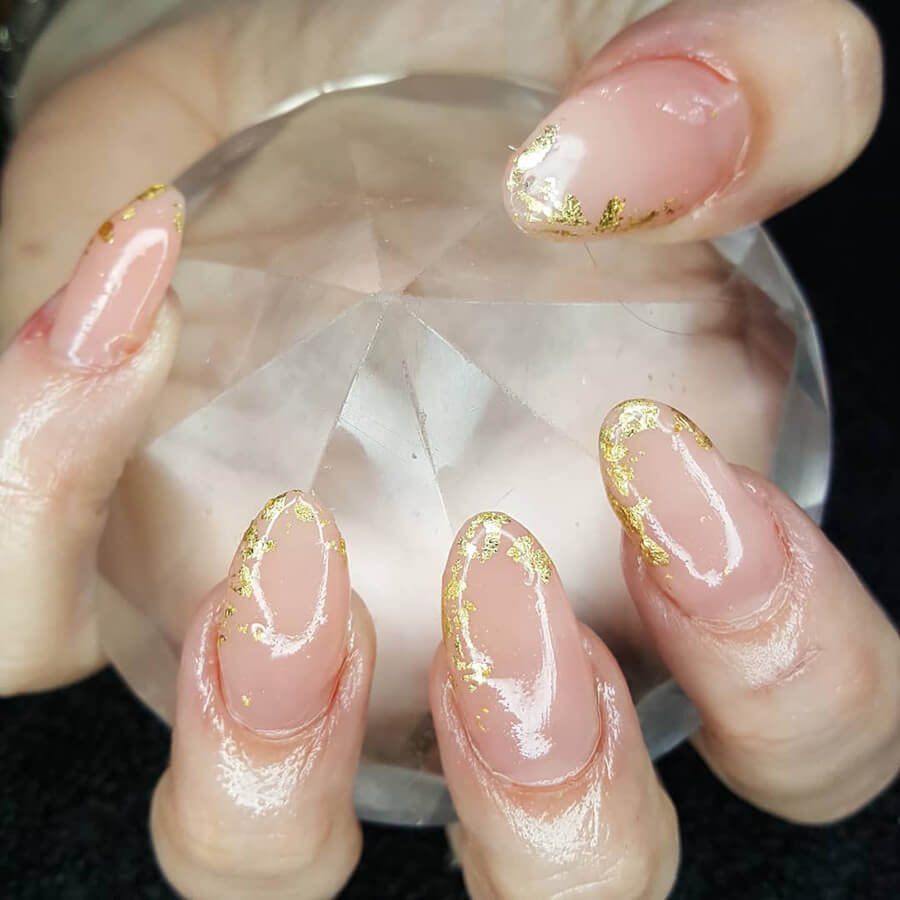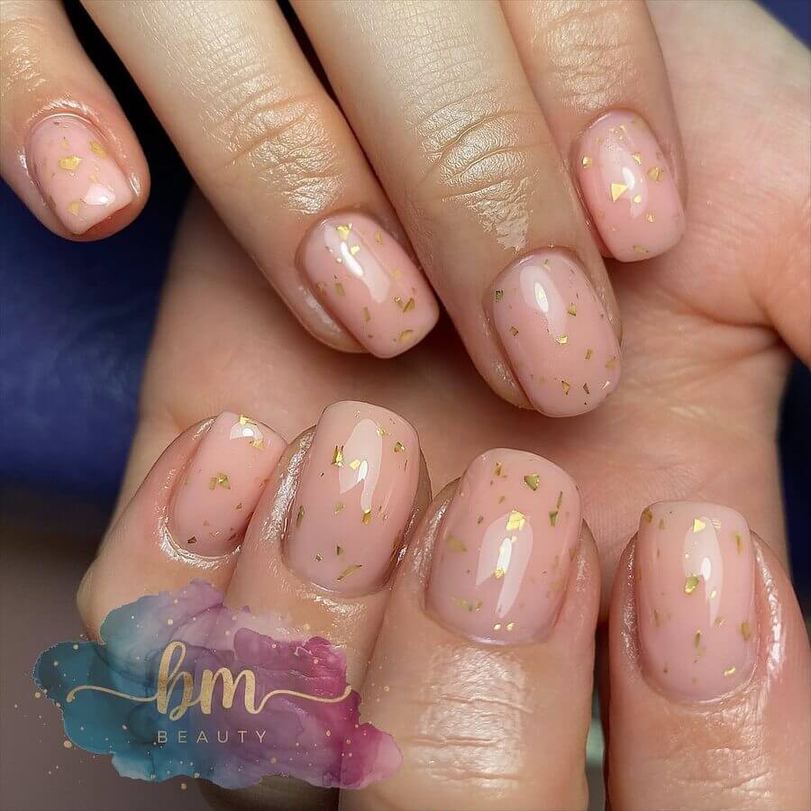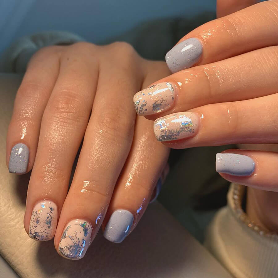 - романтичный вариант с нюдом, пастельным или бесцветным покрытием, сверху которого беспорядочно накладываются фольгированные осколки.