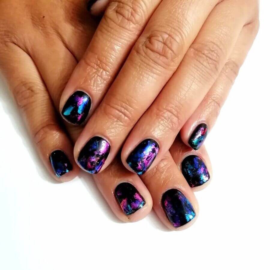 Оригинальных узоров мастер по нейл-арту добивается, когда делает на ногтях разноцветные отпечатки, отрывая слой фольгированной бумаги от покрытия.