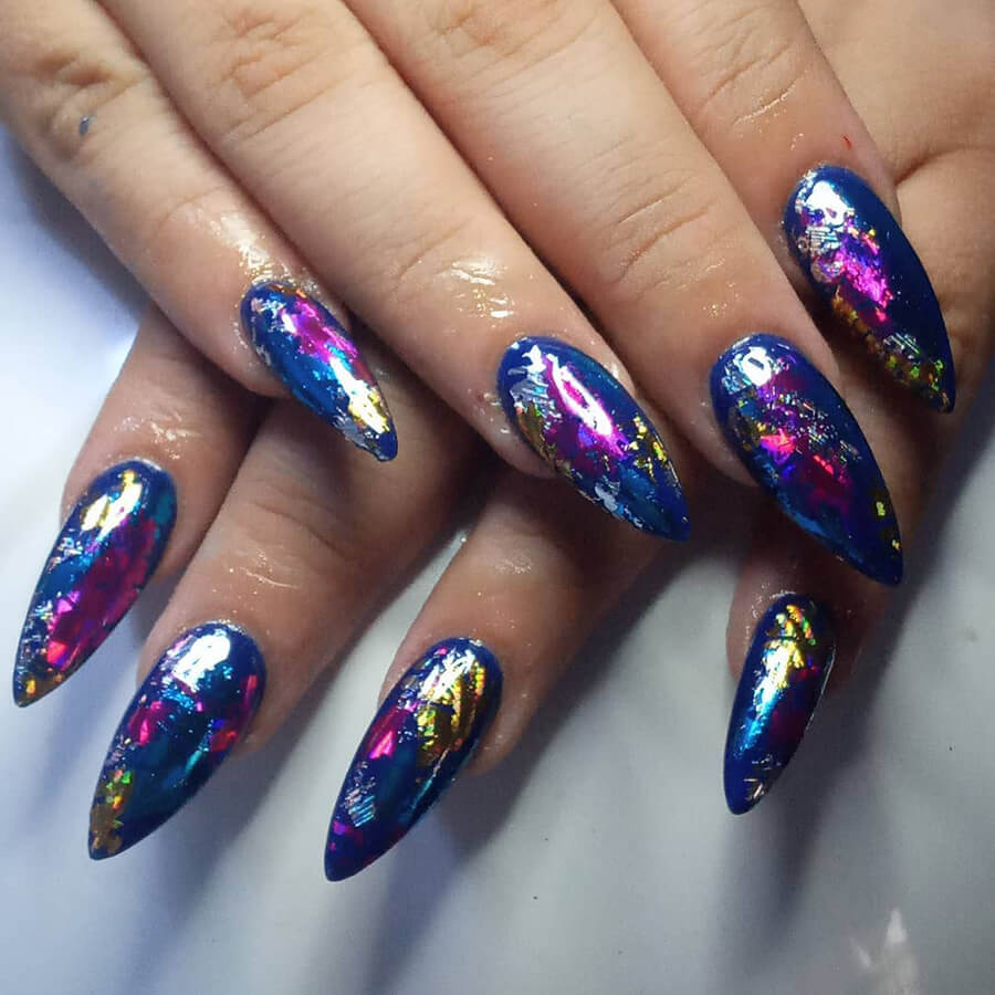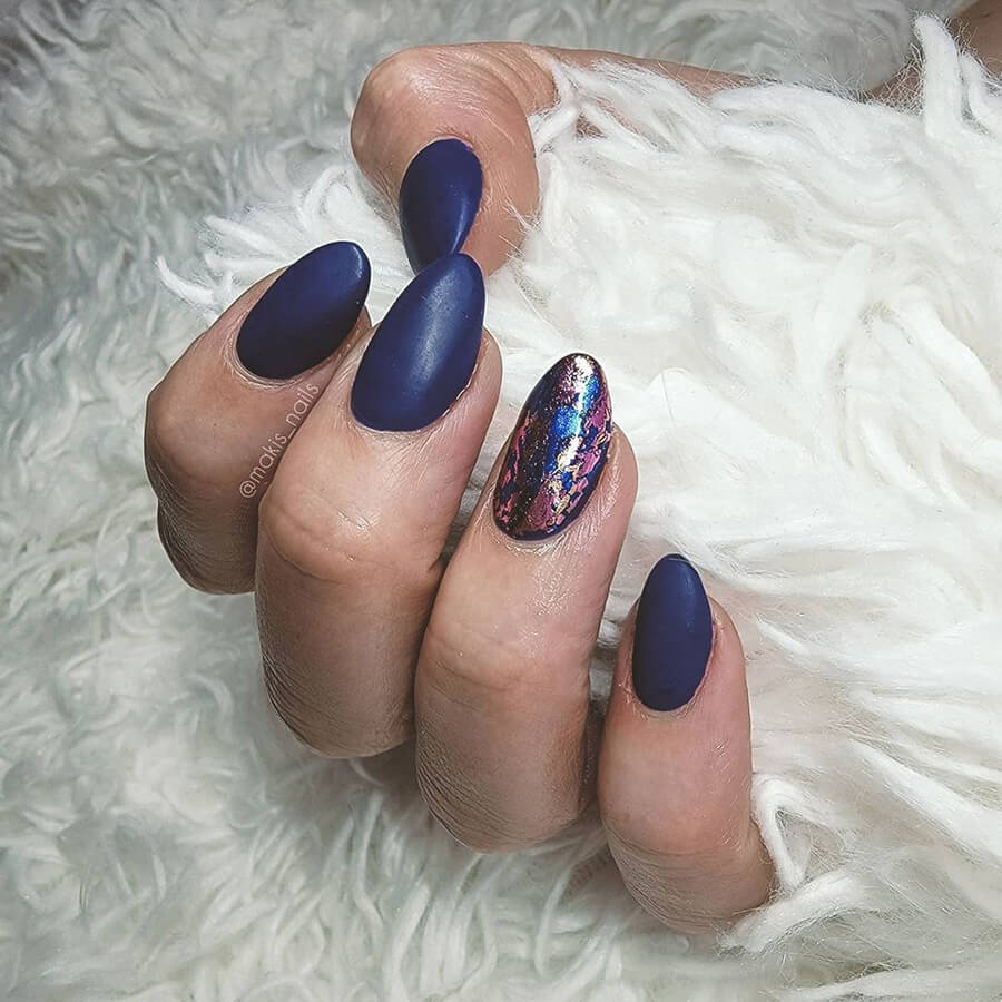 Оттенки синего всегда смотрятся красиво на ногтях любой формы и длины. Это беспроигрышный вариант для повседневного образа, в котором часто присутствуют джинсы. Разнообразить маникюр можно с помощью голографического эффекта.