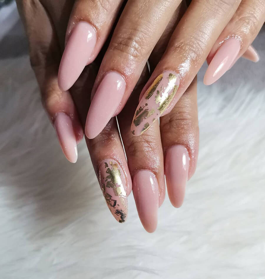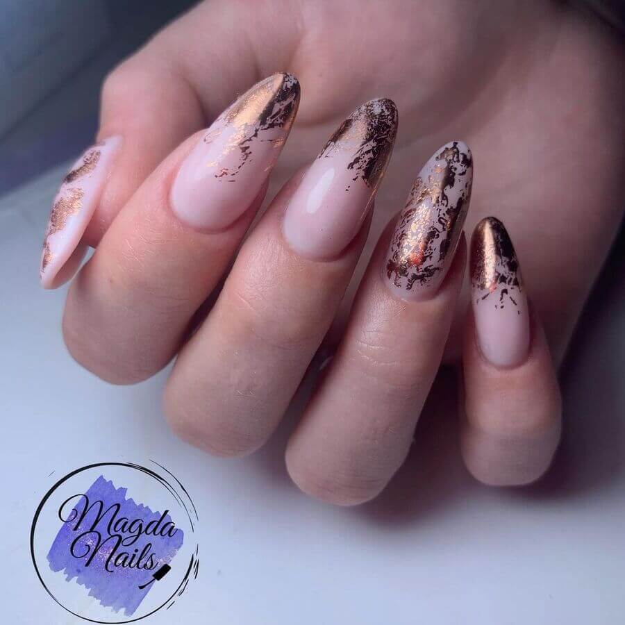 Нюд с фольгой. Нюд помогает сгладить яркость фольги и уравновешивает дизайн. В таком случае фольга наносится не на весь ноготь, а только сверху или снизу. Получается нежная и красивая абстракция. Отлично сочетается сусальная фольга (золотистая, серебристая) с бежевым оттенком. Можно попробовать и дополнительные элементы дизайна в виде страз.