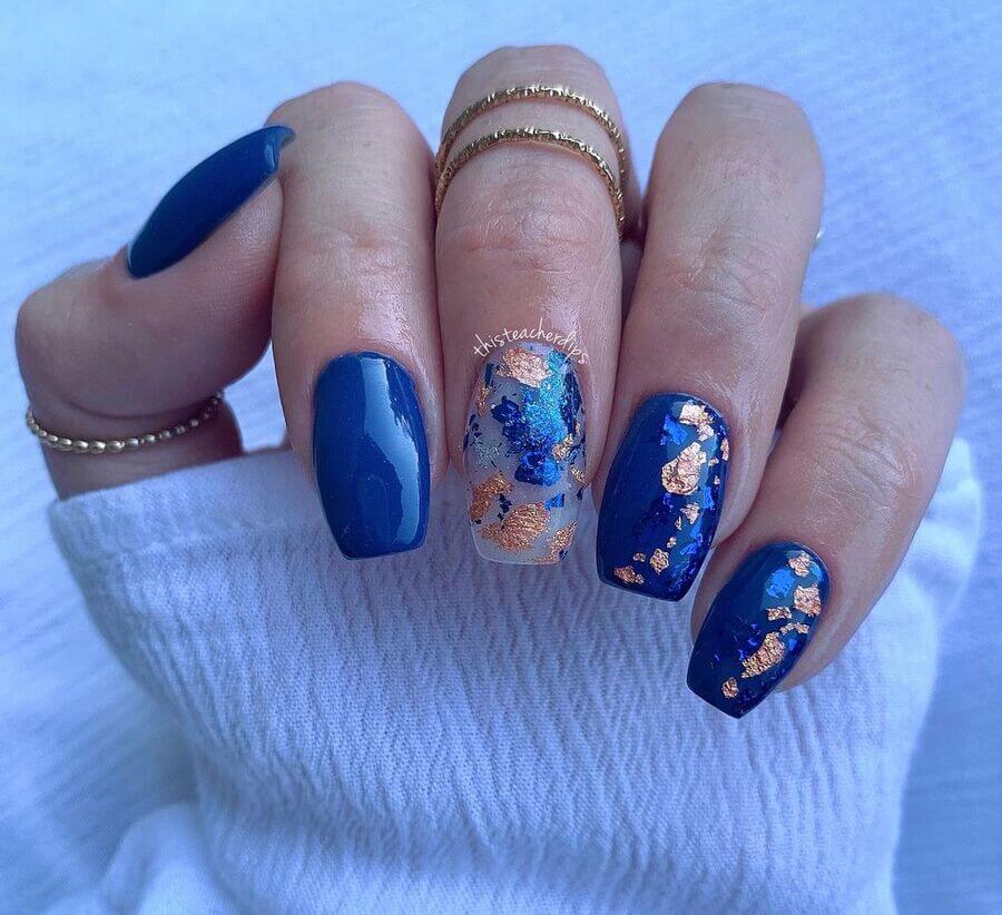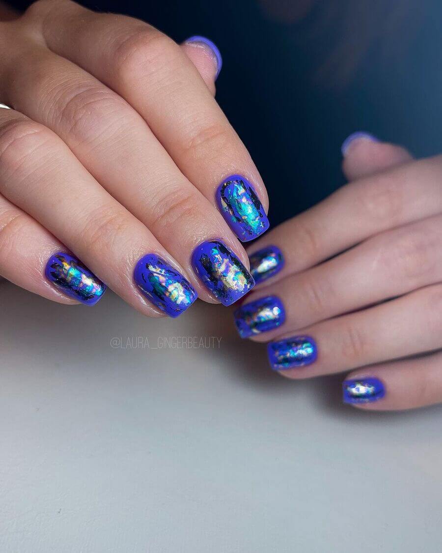 Синий зеркальный маникюр – еще одна очаровательная идея, которая подойдет обладательницам холодного оттенка кожи.