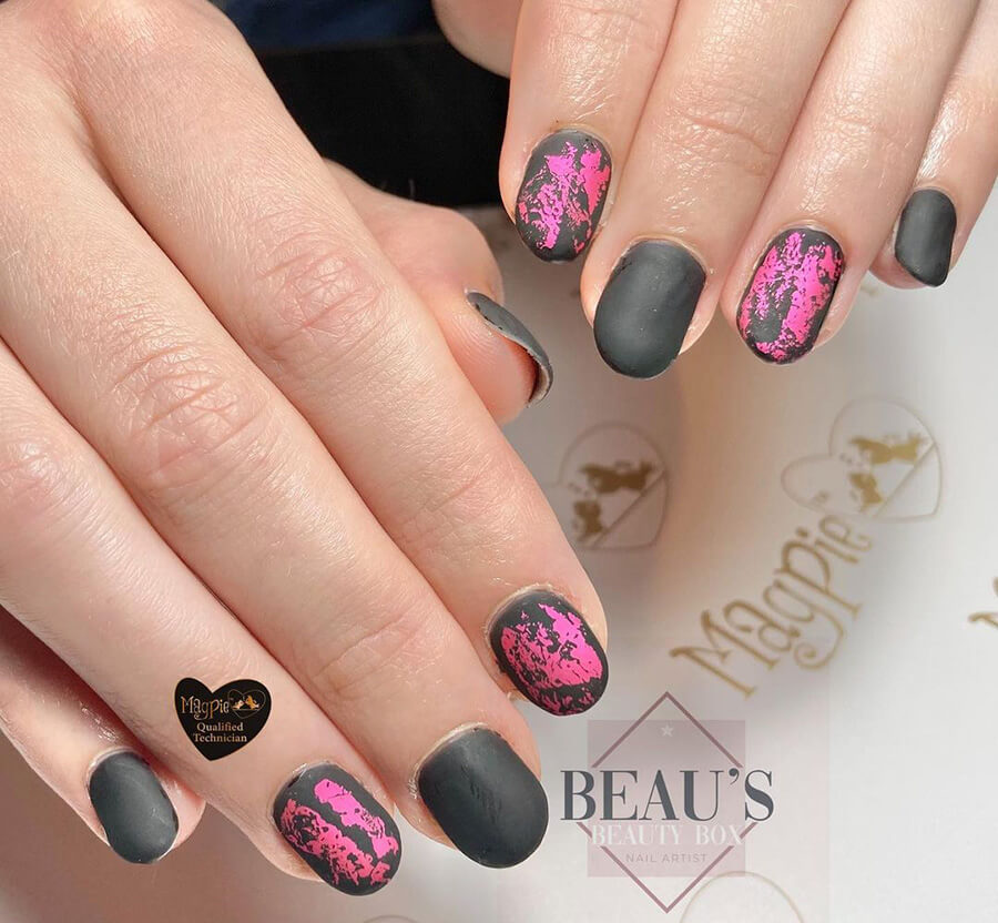Переводная фольга — универсальный инструмент, очень удобный в применении. Он прост, позволяет получить металлический эффект и лично контролировать, какая зона ногтя будет задействована.