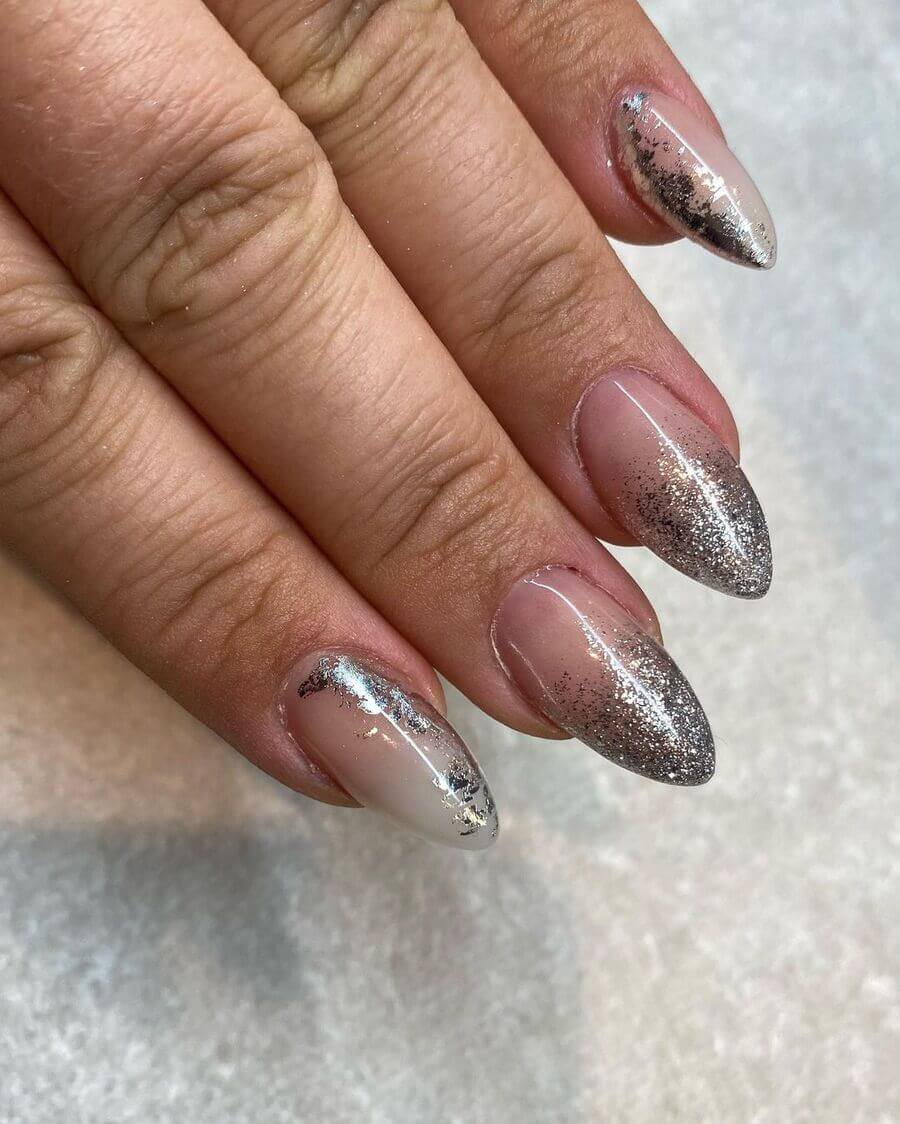 Серебряный блеск подчеркнет безупречную форму ногтя и привлечет к вашим рукам максимум внимания.