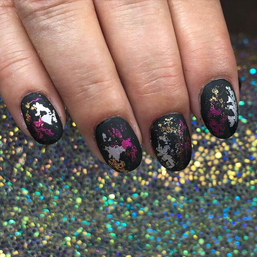 Если добавить кусочки фольги, то получится довольно лаконичный, но вместе с тем необычный и притягивающий внимание цвет. Вовсе не обязательно выполнять на все ногти
