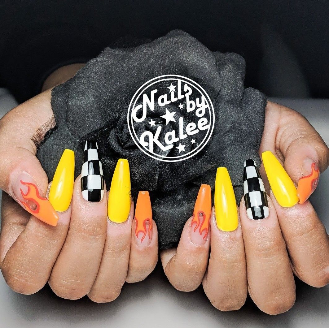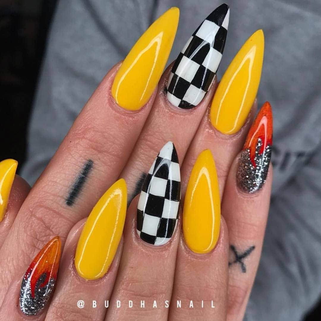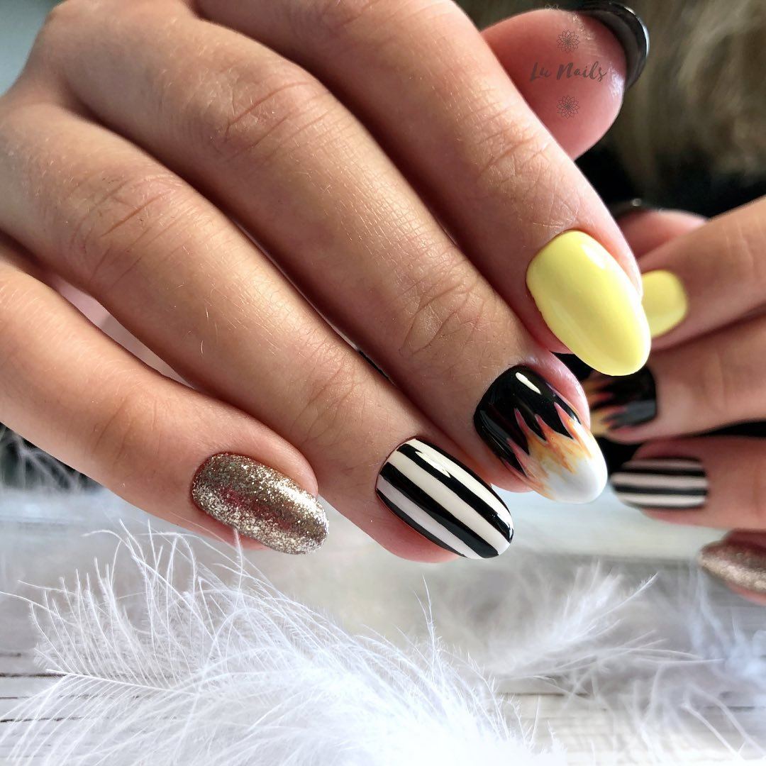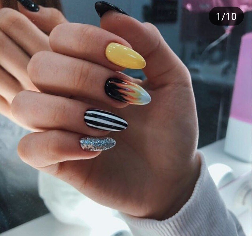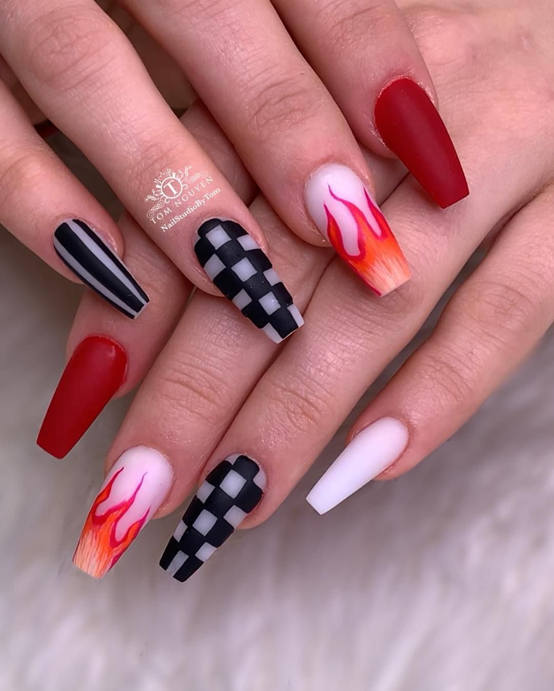 Изображение огня часто сочетают с шахматной доской, полосками и другой геометрией. В тренде нейл-арты в черном и алом цветах с незначительным добавлением белого. На фото ниже вы можете видеть примеры этих оригинальных нейл-артов.
