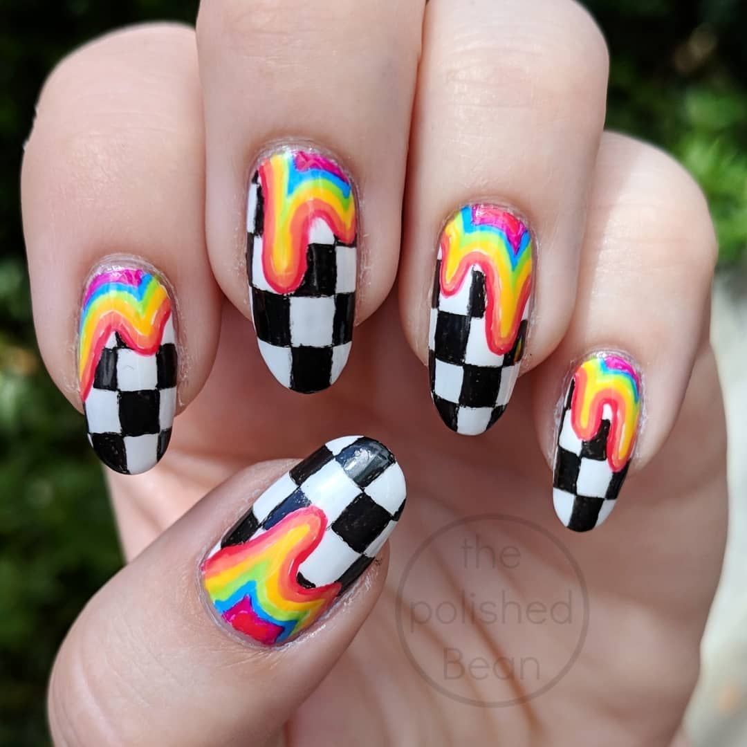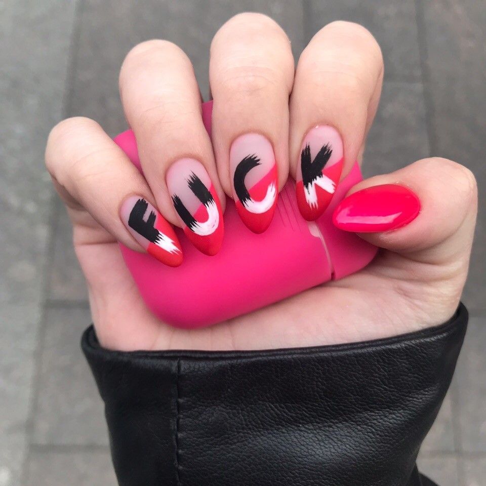 Как мы уже говорили, модное направление гранж является ярким примером отсутствия каких-либо рамок или ограничений, касающихся создания образа, макияжа или маникюра. В нём сочетается всё и со всем. Поэтому подходя к вопросу создания трендового нейл-арта в стиле гранж можно смело экспериментировать и использовать неоновые и кислотные оттенки, которые, как и их тёмные сородичи, являются полной противоположностью лаконичной классике. Среди модных идей броские однотонные ноготки в стиле «вырви глаз» и маникюр с «огненным» дизайном, идеи оформления с шахматной доской, абстракцией и надписями. А также маникюр с элементами негативного пространства, тёмными графическими композициями и радужный маникюр с характерными потёками.