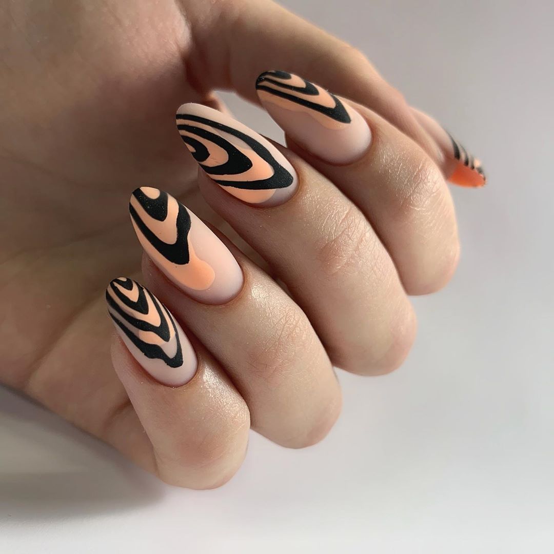 Маникюр в так называемой магнитной технике-специальный магнит формирует специфические узоры сам по себе уже выглядит загадочно и мистически: специально подбирать дизайн под праздник не придется. Какой бы цвет вы ни выбрали, он будет смотреться соответствующе таинственной атмосфере Хэллоуина.