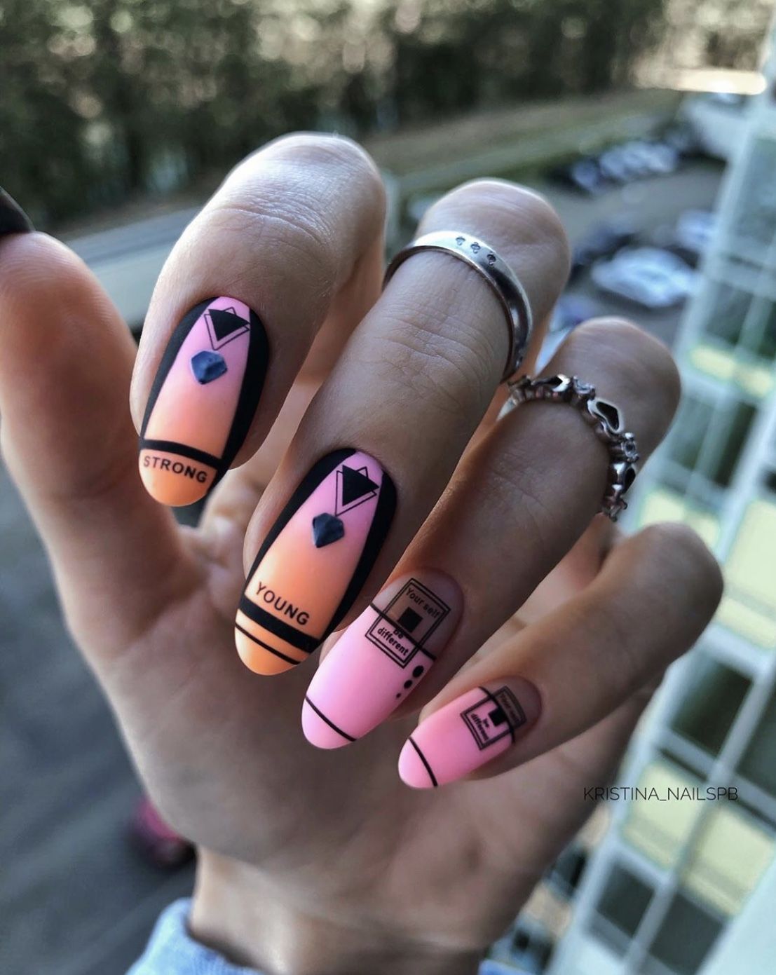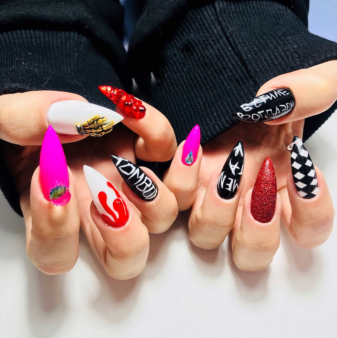 Большинство девушек выбирают драматичный, темный образ, когда речь заходит о готических ногтях, но нет правила, что они должны быть темными. Существует множество ярких идей, вдохновленных готами — например, неоновые, мраморные и забавные рисованные «кавайные» дизайны со буквами, наклейками и так далее.