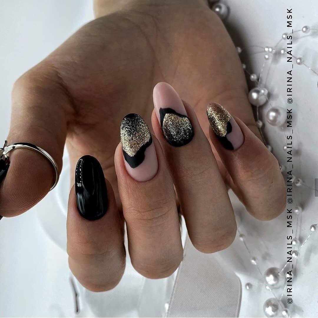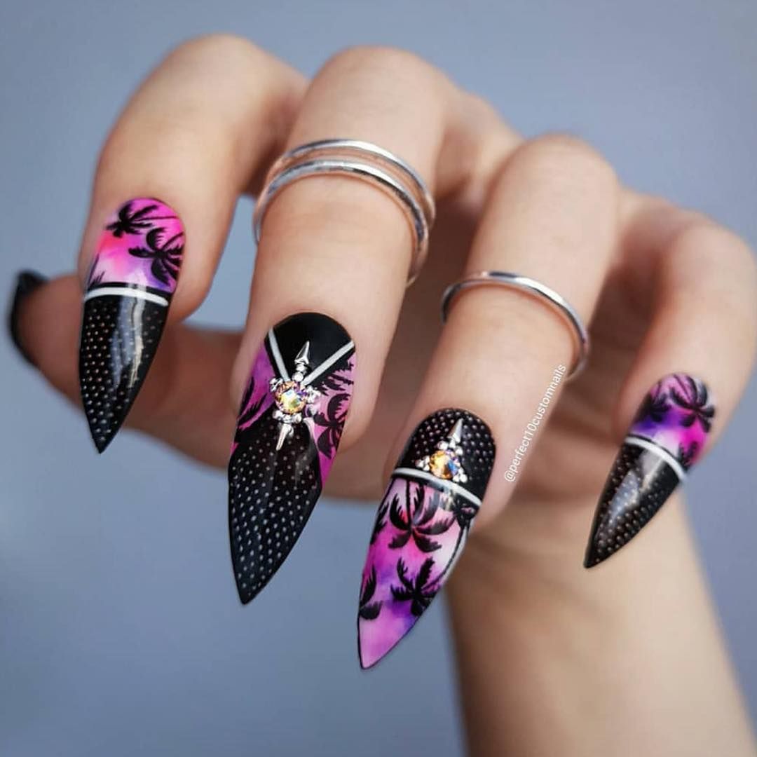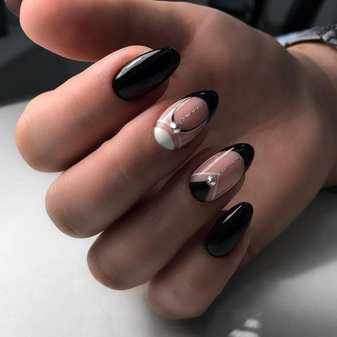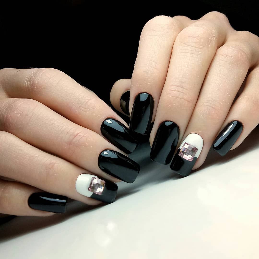 Круто на чёрном покрытии смотрятся стразы, камушки, фольга. Они отражают свет и играют на контрасте: такой маникюр прекрасно подойдёт под городской стиль даже летом. В отпуске лучше отдать предпочтение вариантам поярче. Главное с украшениями — не наносить их на каждый палец, иначе есть риск переборщить. Оптимально — 2 ногтя на каждой руке.