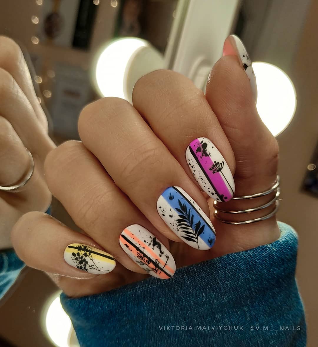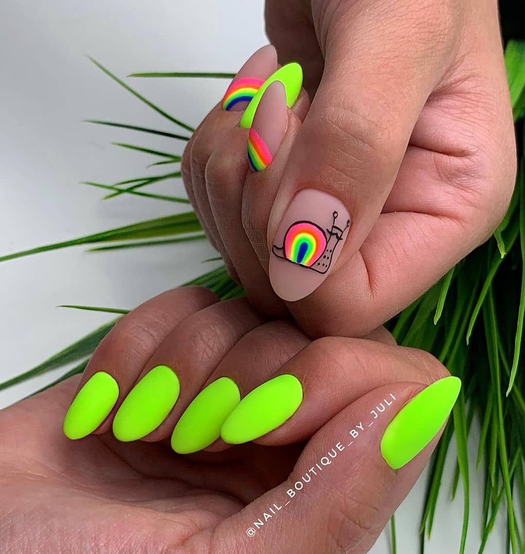 Неоновые или кислотные тона, также как и черный цвет, долгое время воспринимались категорично. Оттенки действительно смотрятся вызывающе и заметно, абсолютно не вписываются в деловые образы. Современные неоновые нейл-арты стали умереннее и повседневннее. Девушки предпочитают использовать матовые неоновые оттенки, которые смотрятся на ногтях мягче и естественнее.