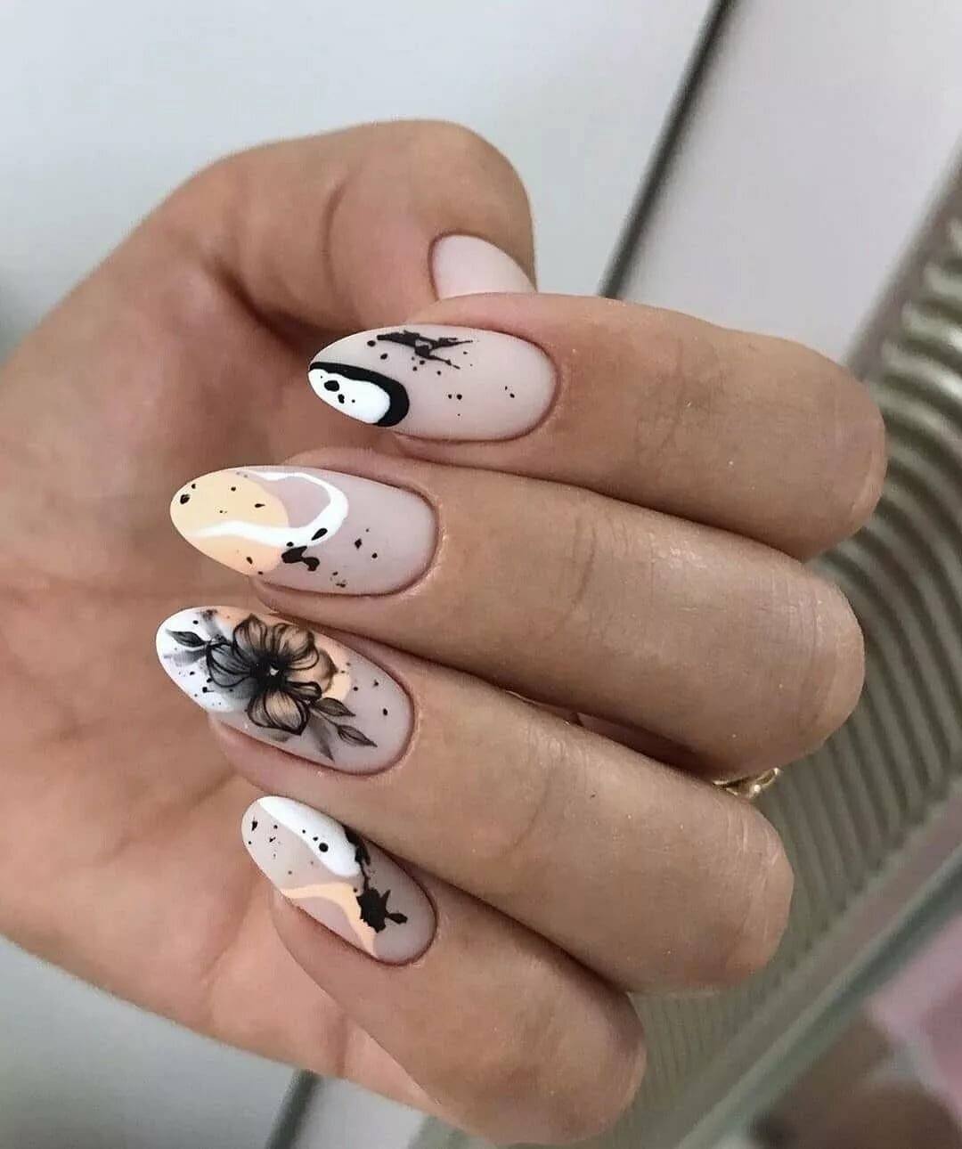 Нюдовые, нейтральные оттенки-отличный чистый холст для воплощения ваших идей. Такие ногти можно украсить различными тематическими наклейками и миниатюрными, аккуратными рисунками. Натюрель не помешает сделать нейл-дизайн в духе самого мрачного праздника года.