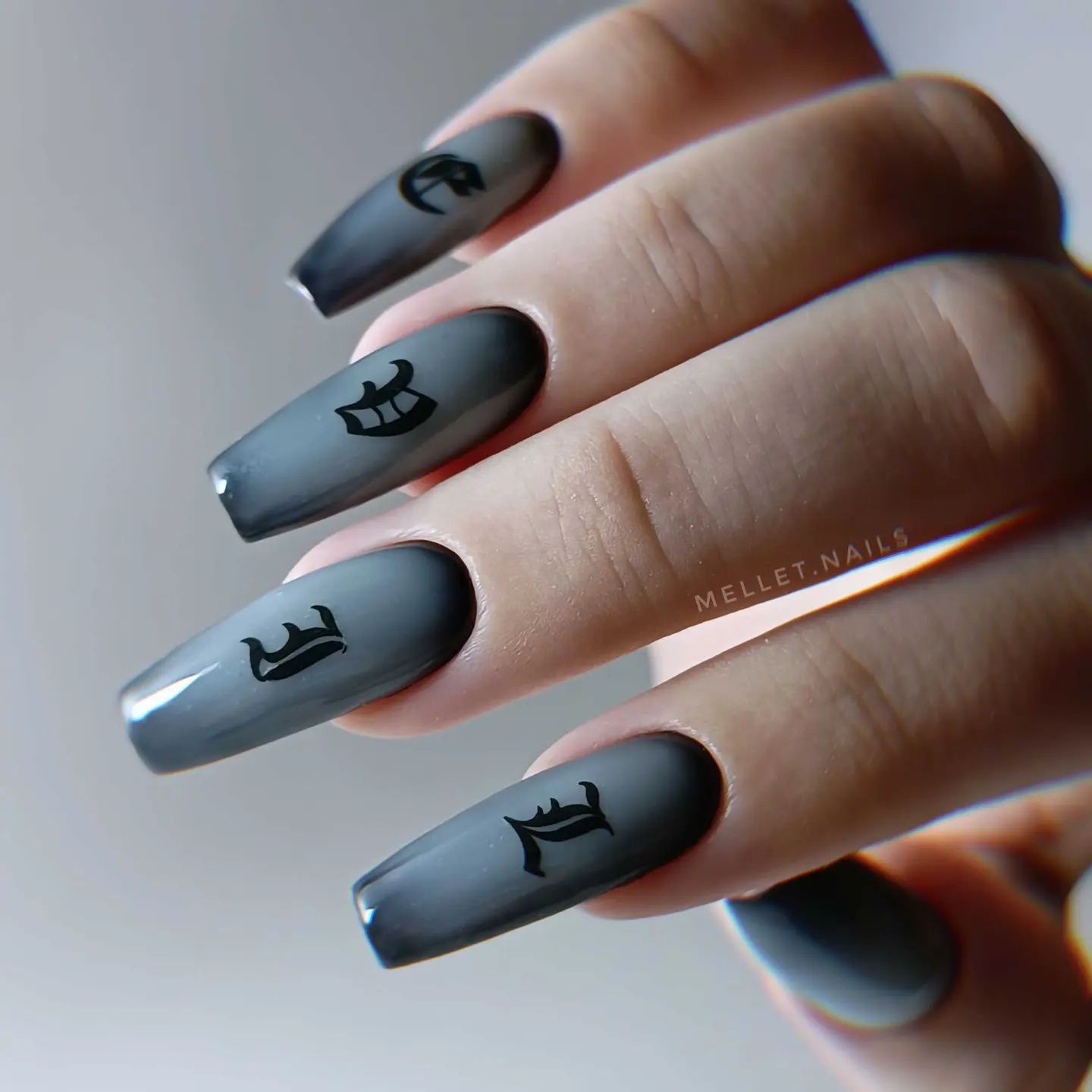 Холодный сине-серый маникюр-омбре с черными готическими буквами: