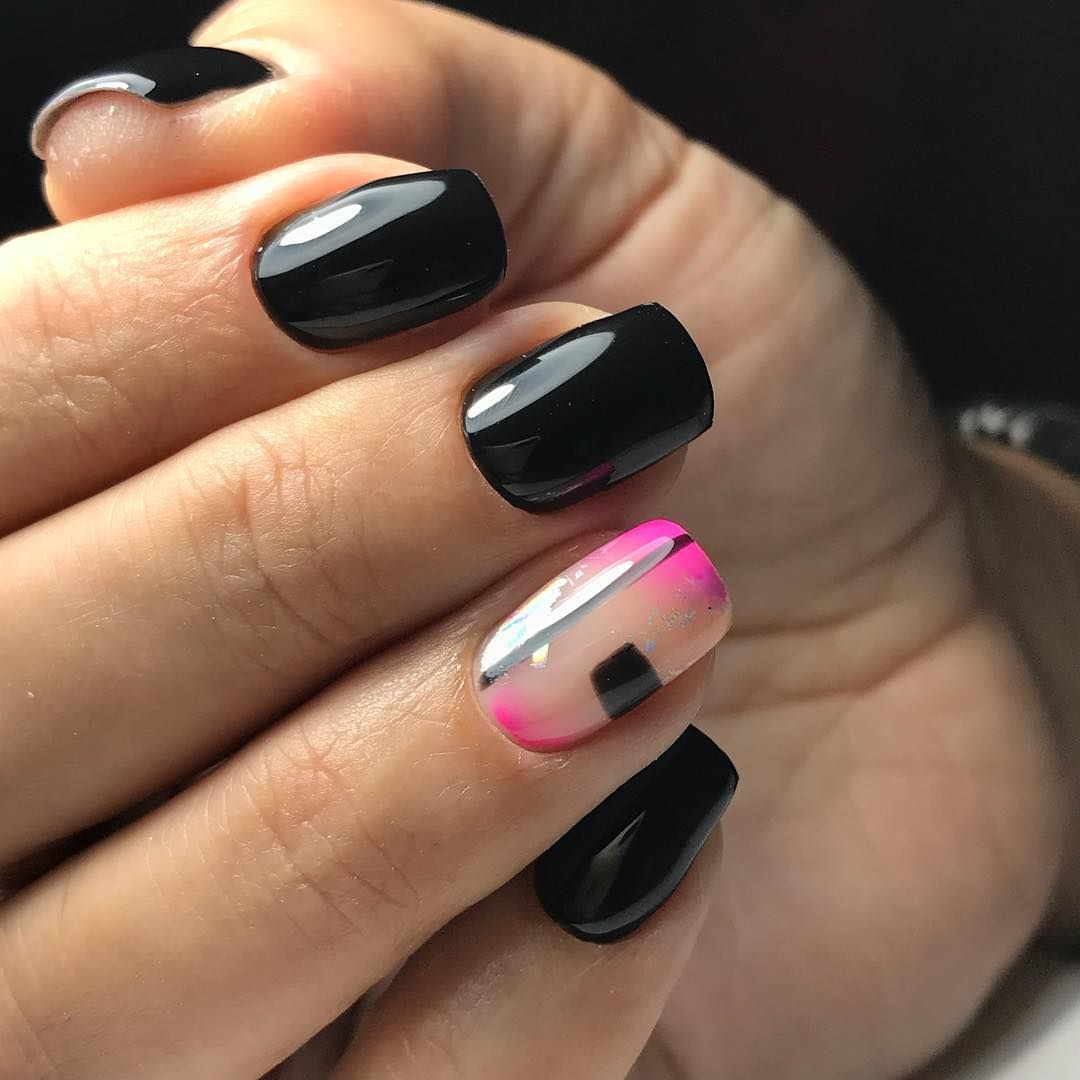Чёрный цвет — базовый, поэтому способен сочетаться со всеми другими цветами как на одном ногте, так и на нескольких. Особенно красиво это получается в технике омбре: когда один оттенок плавно переходит в другой. Черный может быть как у лунки, так и на кончике ногтя.
