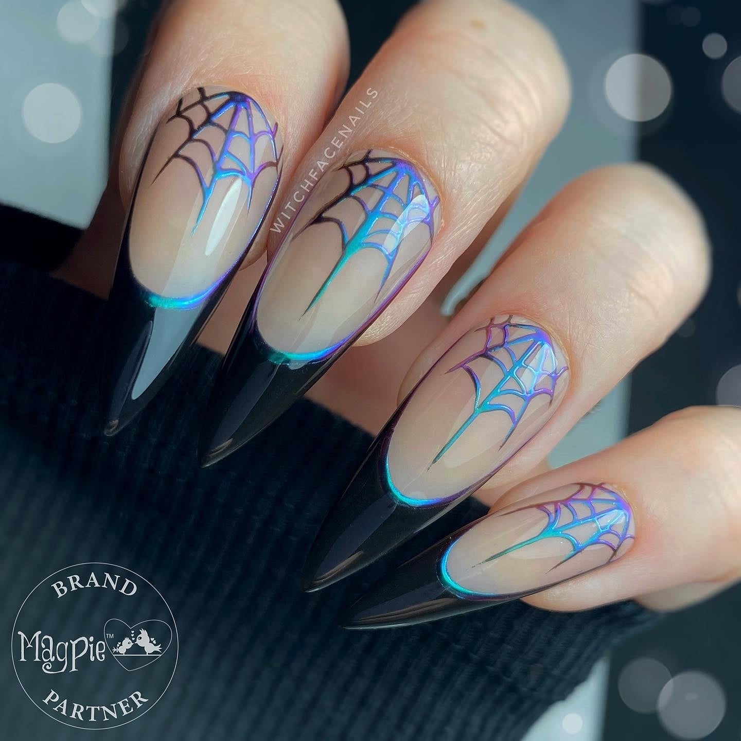 Тонкая, серебристая, паутинная сеточка украсит ногти любой длины и добавить мрачную нотку в ногтевой дизайн. Можно разместить узор из миниатюрных паучков, если размер ногтевого ложа позволяет.