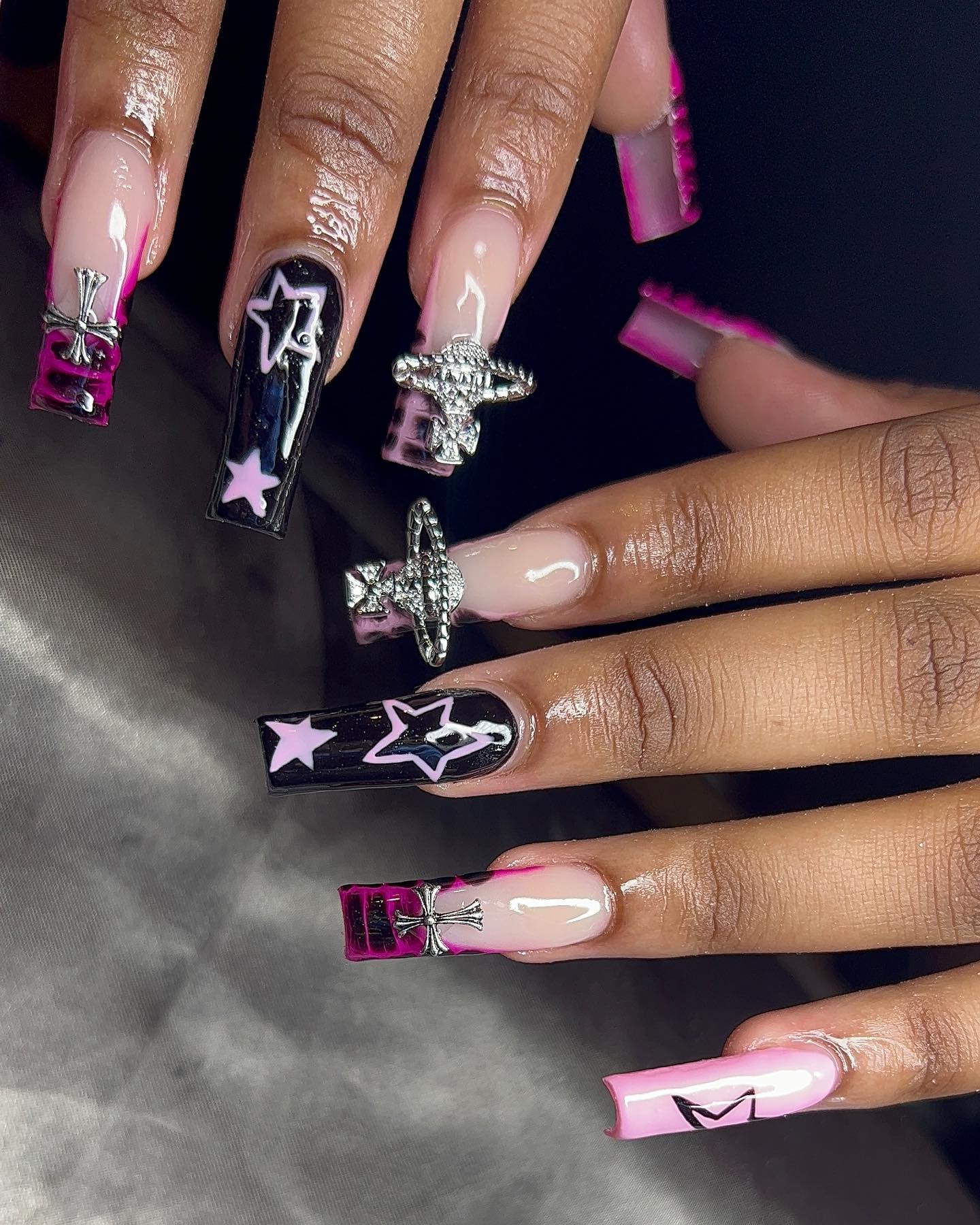 Вы также можете использовать французское омбре с блестками или неоновыми цветами, чтобы сделать ногти еще более выразительными. Это идеальный вариант для любого случая, независимо от того, хотите ли вы выглядеть повседневно или нарядно. Если сочетать этот вид с темными цветами одежды и татуировкой дракона или волка, он создает более аутентичное готическое настроение.