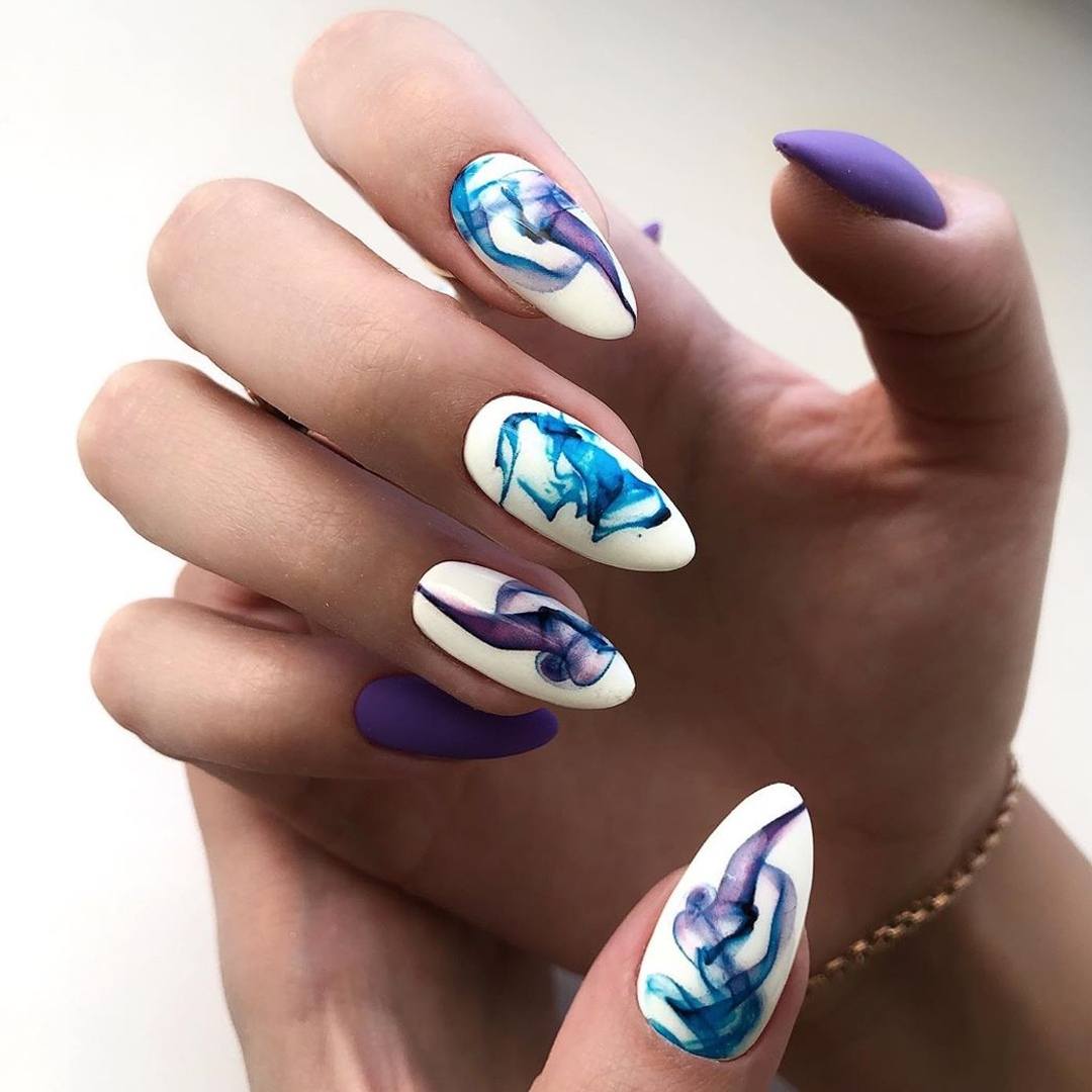 Интересная техника, так же имеющая своеобразные узоры-маникюр под мраморную поверхность позволяет сделать маникюр даже в домашних условиях. Маникюр с водными разводами смотрится впечатляюще и легок в исполнении.