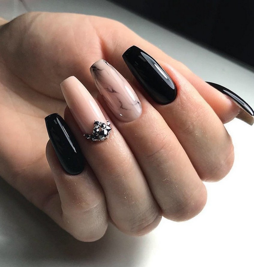 Броскому декору и полубесформенной росписи следует предпочесть минимализм узоров и украшений. Чем длиннее ногтевая пластина, тем больше она уже привлекает внимания своим размером и цветовым оформлением. Дополнительное декорирование стоит свести к минимуму. Идеально сочетаются с такой формой четкая геометрия, блеск, небольшое количество стразов. Строгие и лаконичные решения с одним акцентным ногтем будут смотреться более стильно и говорить о хорошем вкусе хозяйки.