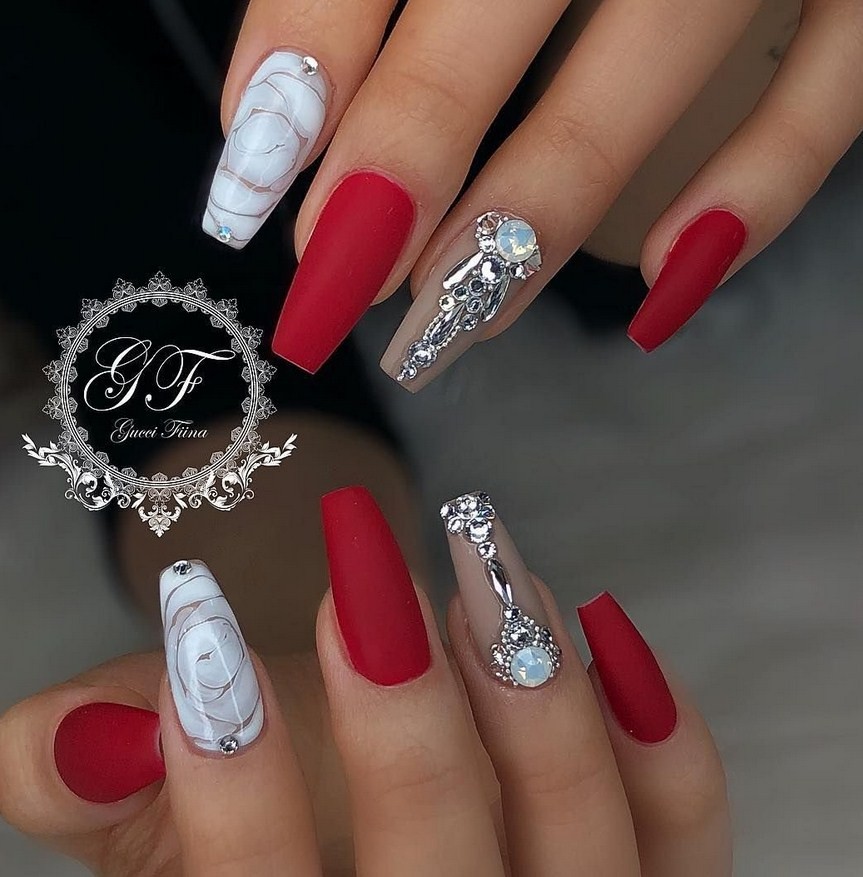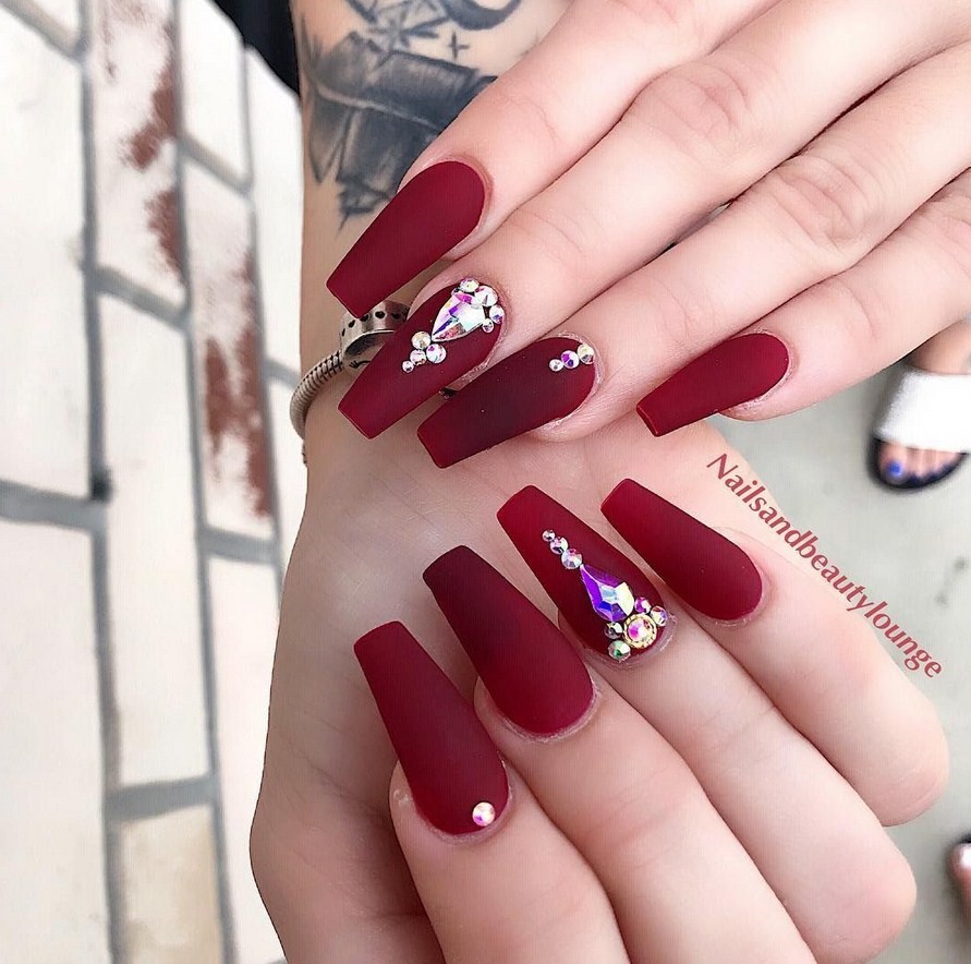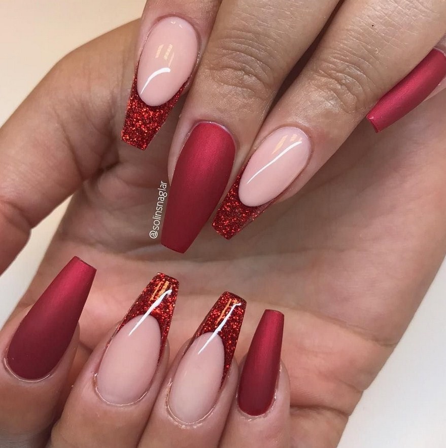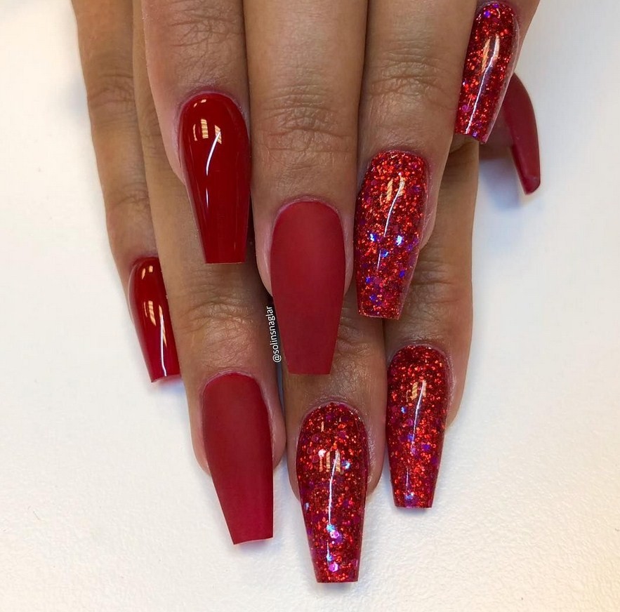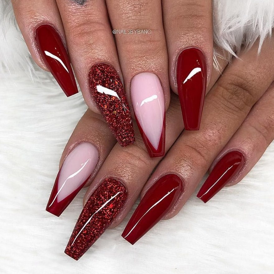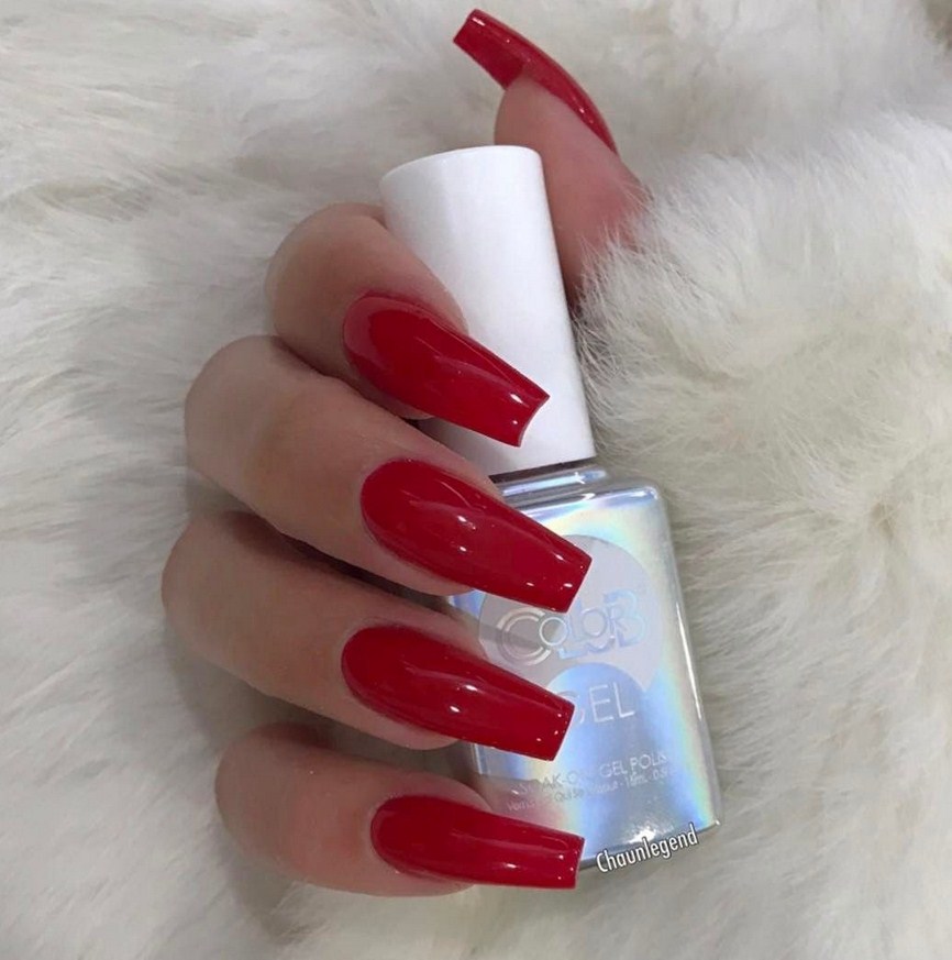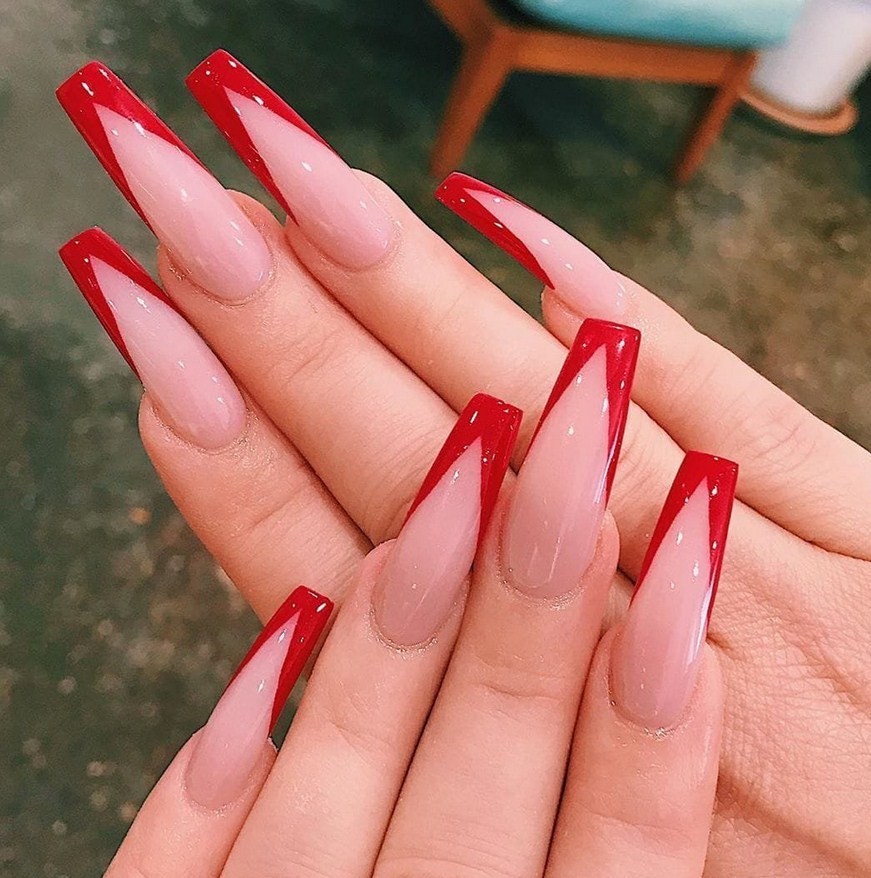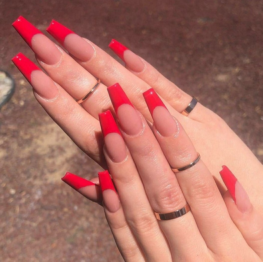 Яркий красный цвет – хороший вариант маникюра для ногтевых пластин формы балерина.