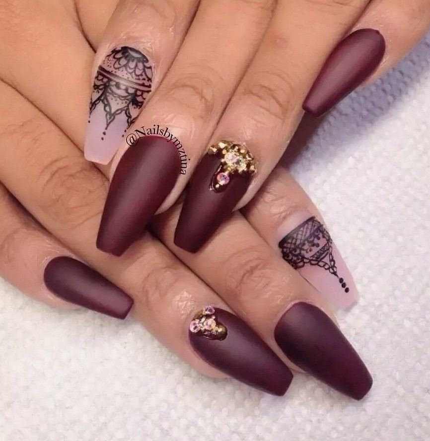 На ногтях пуантах великолепно выглядят геометрический маникюр. Ограничьтесь лаконичным узором на 1-2 ногтях, используя при этом чередование тонких и толстых линий, оригинальные узоры мехенди, ромбы и другие фигуры.