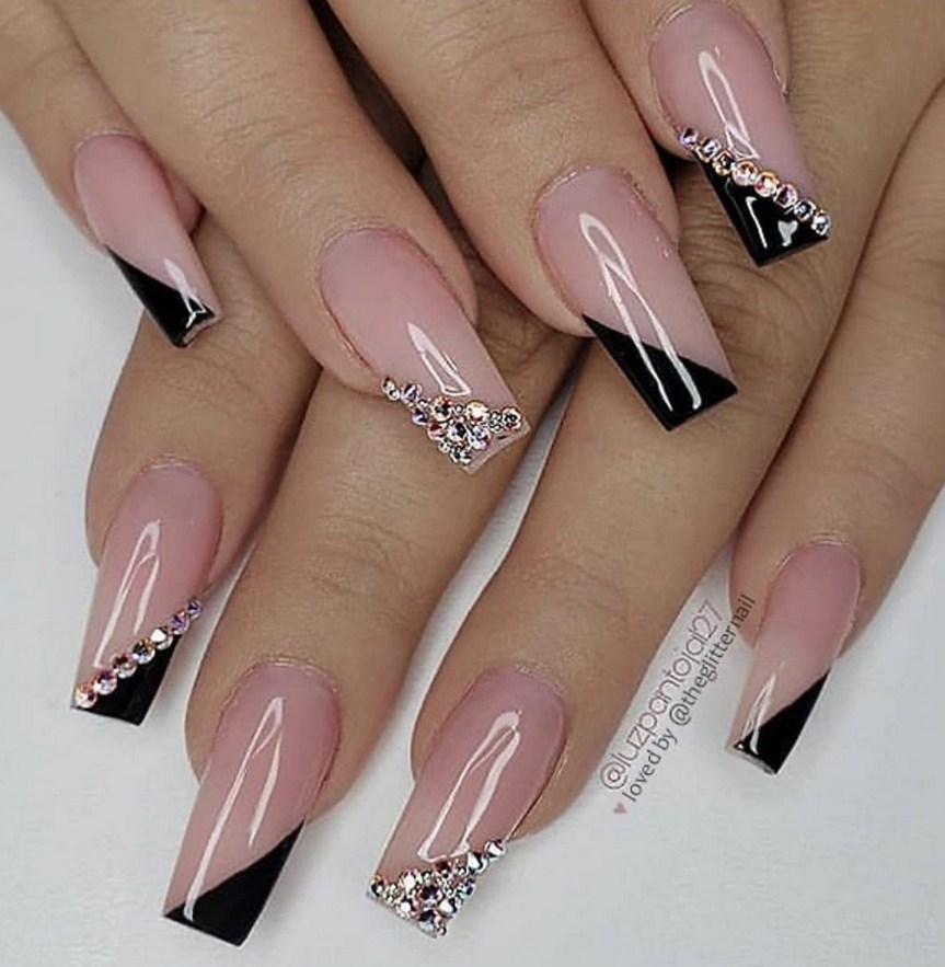 Идеальным вариантом оформления ногтей пуанты считаются стразы. Мастера используют несколько камней разного размера для акцентирования прикорневой лунки или выделения середины ногтя. Такой дизайн выглядят одновременно сдержанно и торжественно.