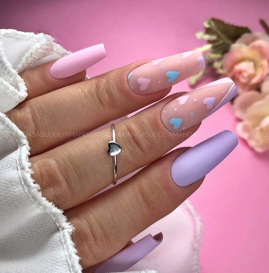 Градиент – аналог омбре, но в этом варианте его растягивают на все пальцы. При этом оттенки должны быть в одной гамме. Например, в случае на фото ниже использованы мягкие и романтичные пастельные оттенки: желтый, голубой, лавандовый.