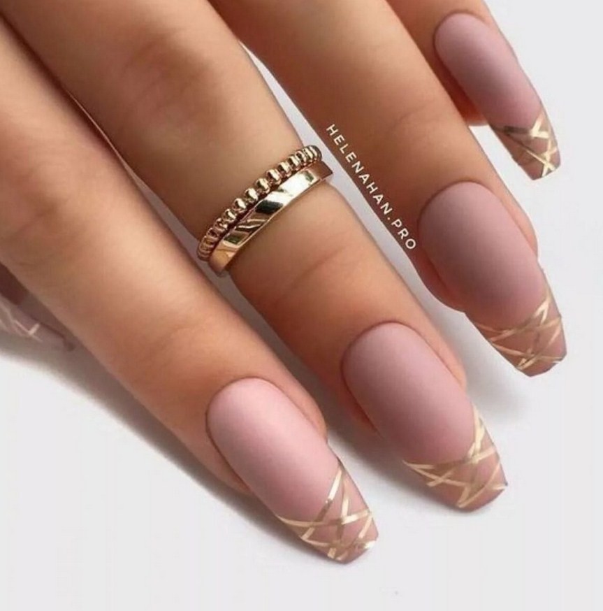 - Нежно-розовый, золотые полоски и блестки. Красивый и женственный маникюр с небольшим дизайном. В этом варианте все просто: на безымянный наносим розовый цвет, клеем полоски. На остальные пальчики наносим блестки.
